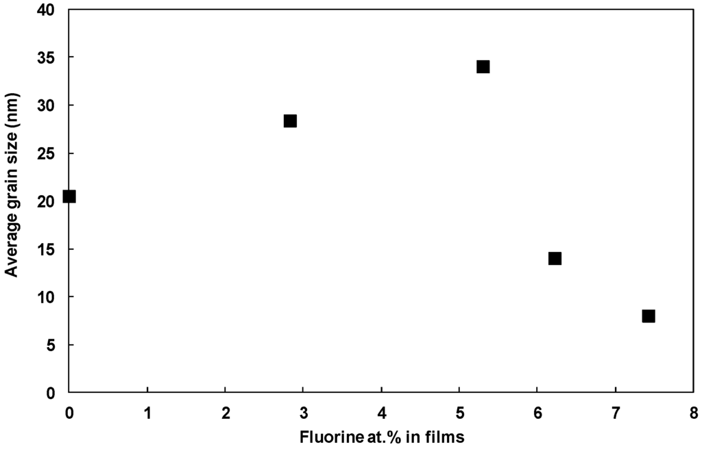 Average grain size variation as a function of fluorine atomic content in the FTO thin films.