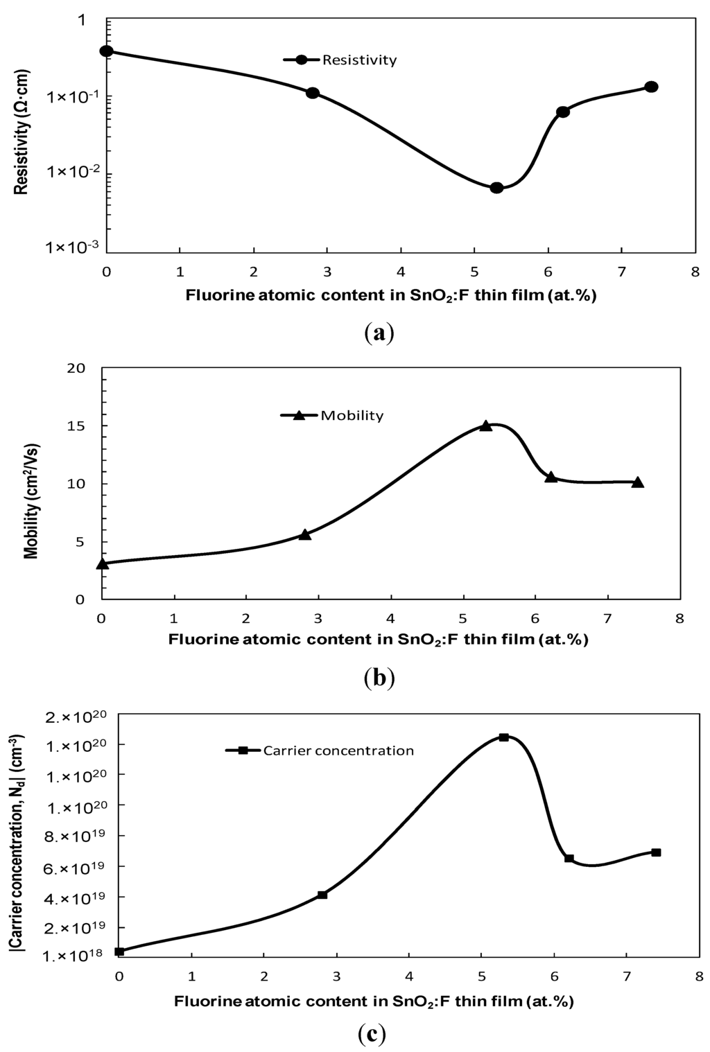 Variation of: (a) resistivity in logarithmic scale; (b) mobility; and (c) absolute carrier concentration of FTO thin films as a function of fluorine atomic content.