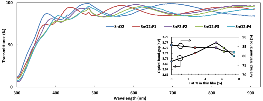 The optical transmittance and the direct band-gap properties of SnO2:F films as a function of fluorine content in the thin films are presented in Figure 5 and Figure 6, respectively. The transmittance data of each sample was recorded three times and an average taken. The optical transmittance (T) was averaged over the wavelength range of 300–900 nm, and the absorption coefficient (α) was determined by using Equation (3),