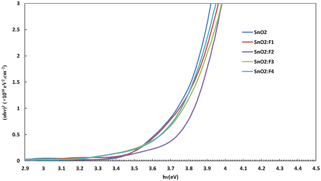 The direct band-gap for un-doped tin oxide was estimated to be 3.70 eV, which increased slightly to a value of 3.77 eV at a fluorine content of 5.4 at.% in the film as observed in Figure 6. The direct band-gap values obtained in this work are slightly higher than the direct band-gap values of 3.17–3.45 eV reported in [] and slightly lower than the band-gap values of 4.0–4.25 eV reported in []. This variation is probably attributed to the different concentration of fluorine used in the film, the thickness variation and the experimental variables such as working pressure and deposition temperature.