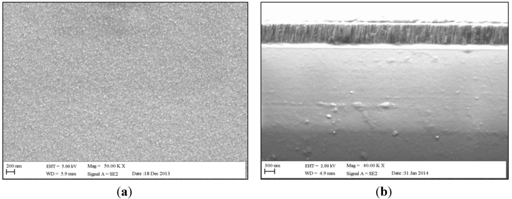 Figure 7a,b shows the surface area and the cross-section SEM morphologies of SnO2:F2 film, respectively. The film has a compact and dense homogenous surface characterised by small grains. The small grains observed in Figure 7a are probably a result of the low deposition temperature. Consonni et al. studied the effect of deposition temperature and observed an increase in the mean grain size from 60 to 127 nm as the growth temperature raised from 360 to 460 °C.