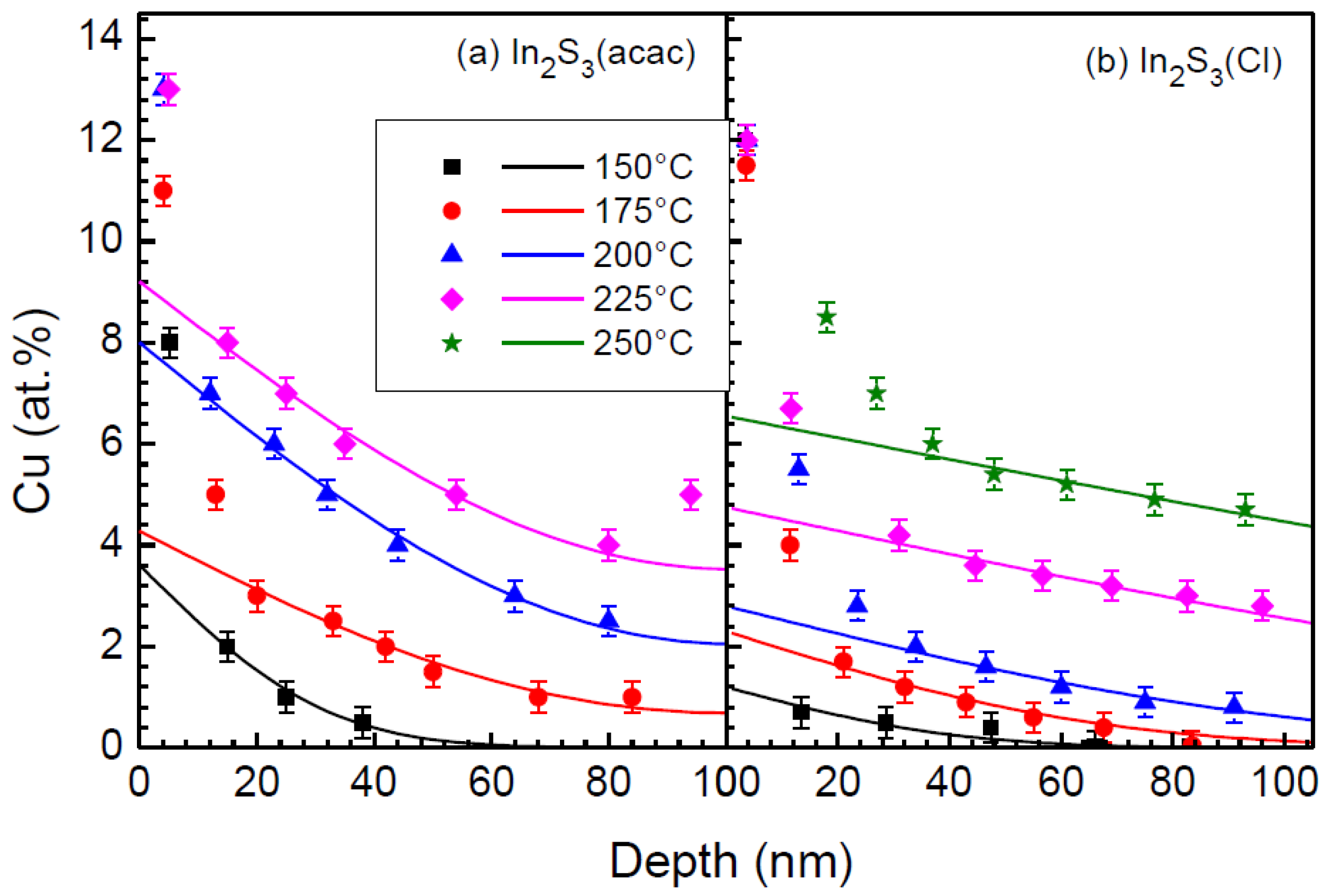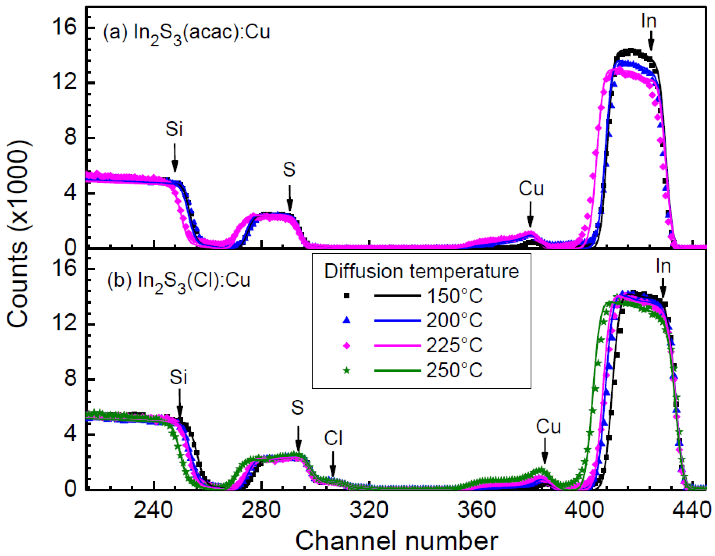 - Juma, A.O.; Pistor, P.; Fengler, S.; Dittrich, T.; Wendler, E. Copper diffusion in thin In2S3 layers investigated by Rutherford Backscattering spectroscopy. Thin Solid Films 2012, 520, 6740–6743. [Google Scholar] [CrossRef]