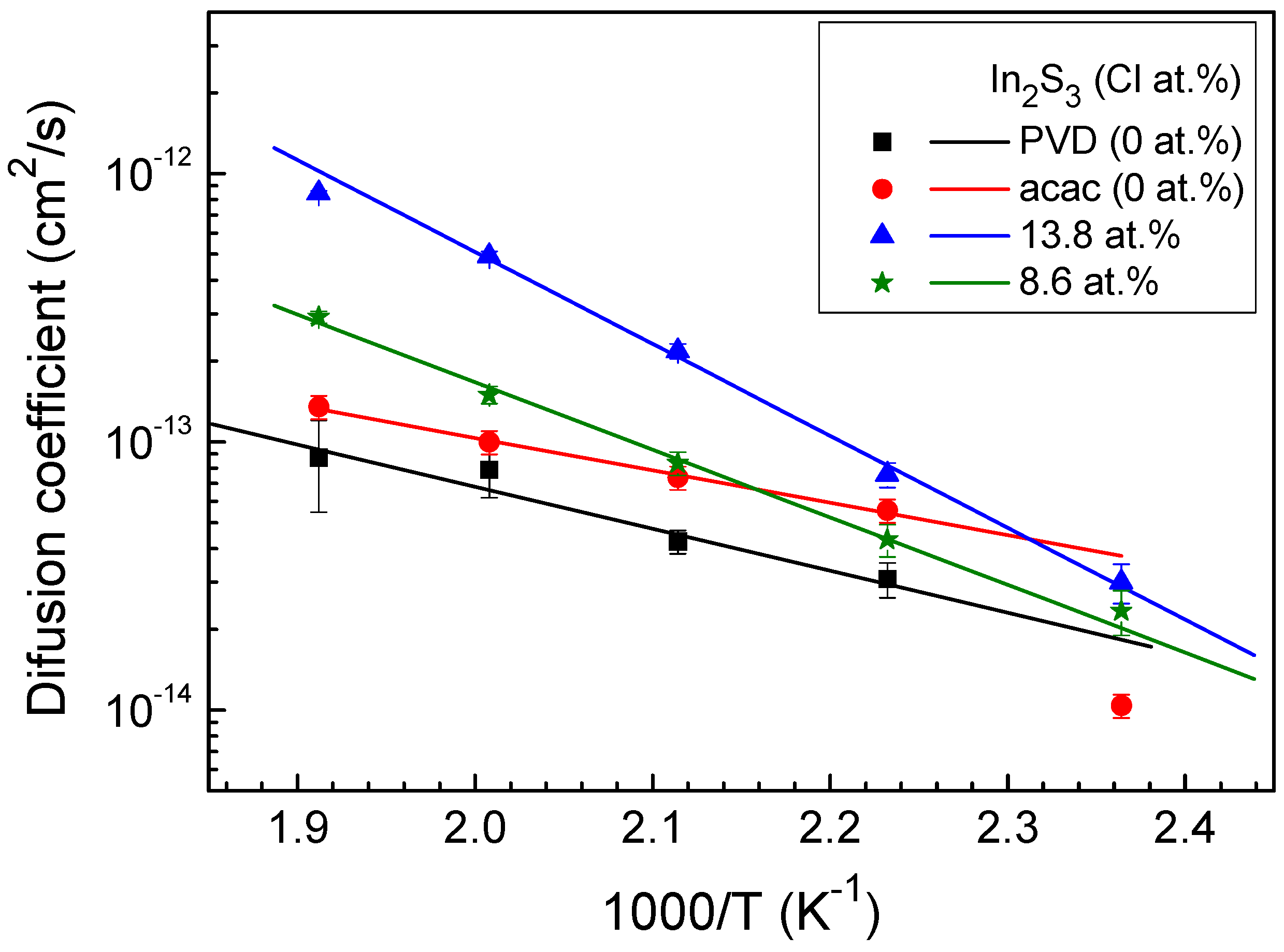 | In2S3 films | Activation energy EA (eV) | Exponential prefactor D0 (cm2/s) |