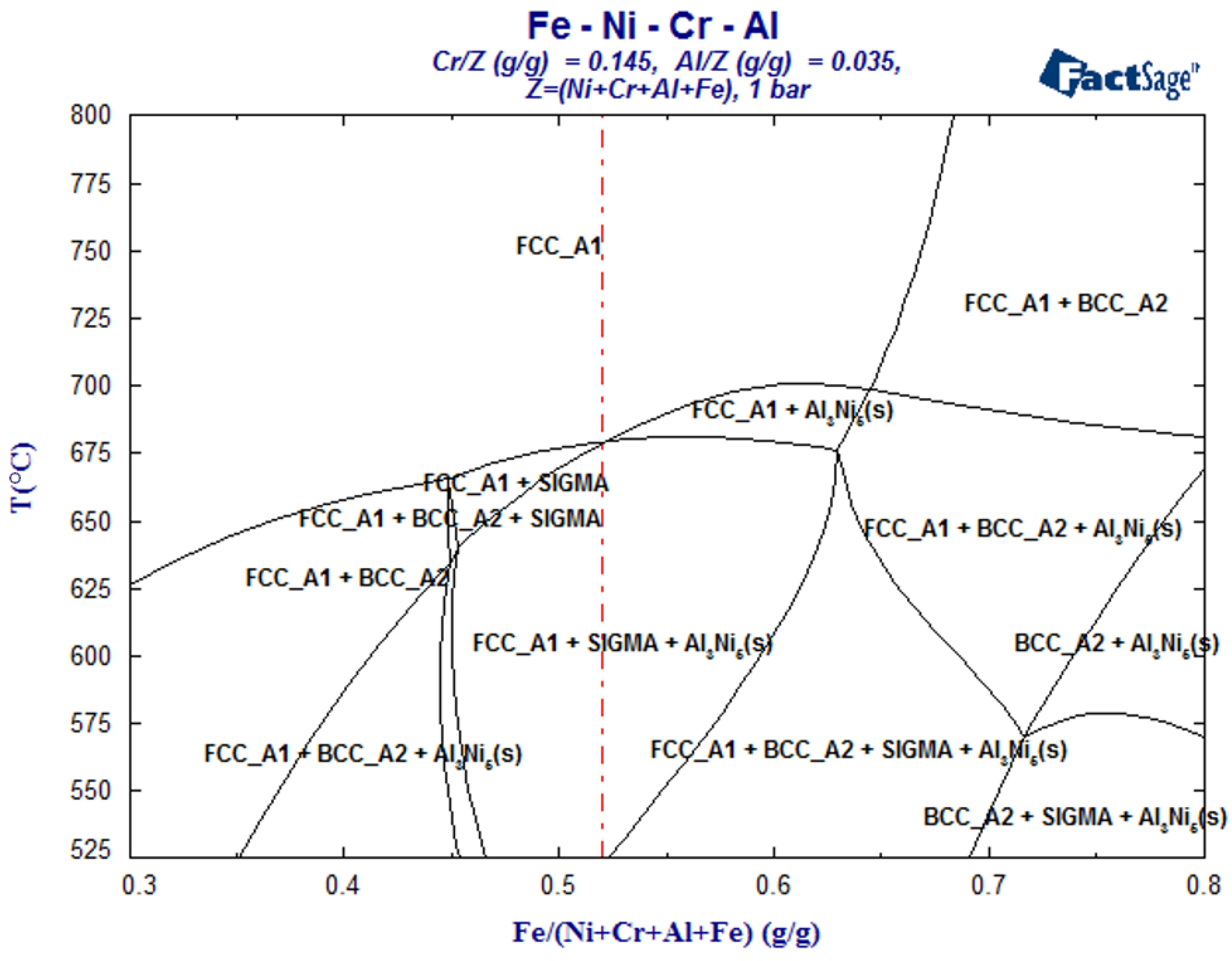 The material tailoring for oxy-combustion conditions began with composition selection by thermodynamic calculation. Iron was chosen as the base material, because it is inexpensive, and cost effective material solutions are valued. The thermodynamic calculations were made with the FactSage 6.3 program using the FSsteel database and a custom-compiled database for the environment and deposit. Based on the calculations (Figure 1), Fe-30Ni-14.5Cr-3.5Al, the red dotted line in the Figure 1, was chosen as the material composition. The phase diagram (Figure 1) shows that at temperatures over 675 °C the structure should be fully austenitic (FCC_A1) with fully soluble alloying elements. The material might have some problems with the formation of a brittle σ-phase under temperature of 675 °C. Additionally Al3Ni6 precipitates can form under 675 °C.
