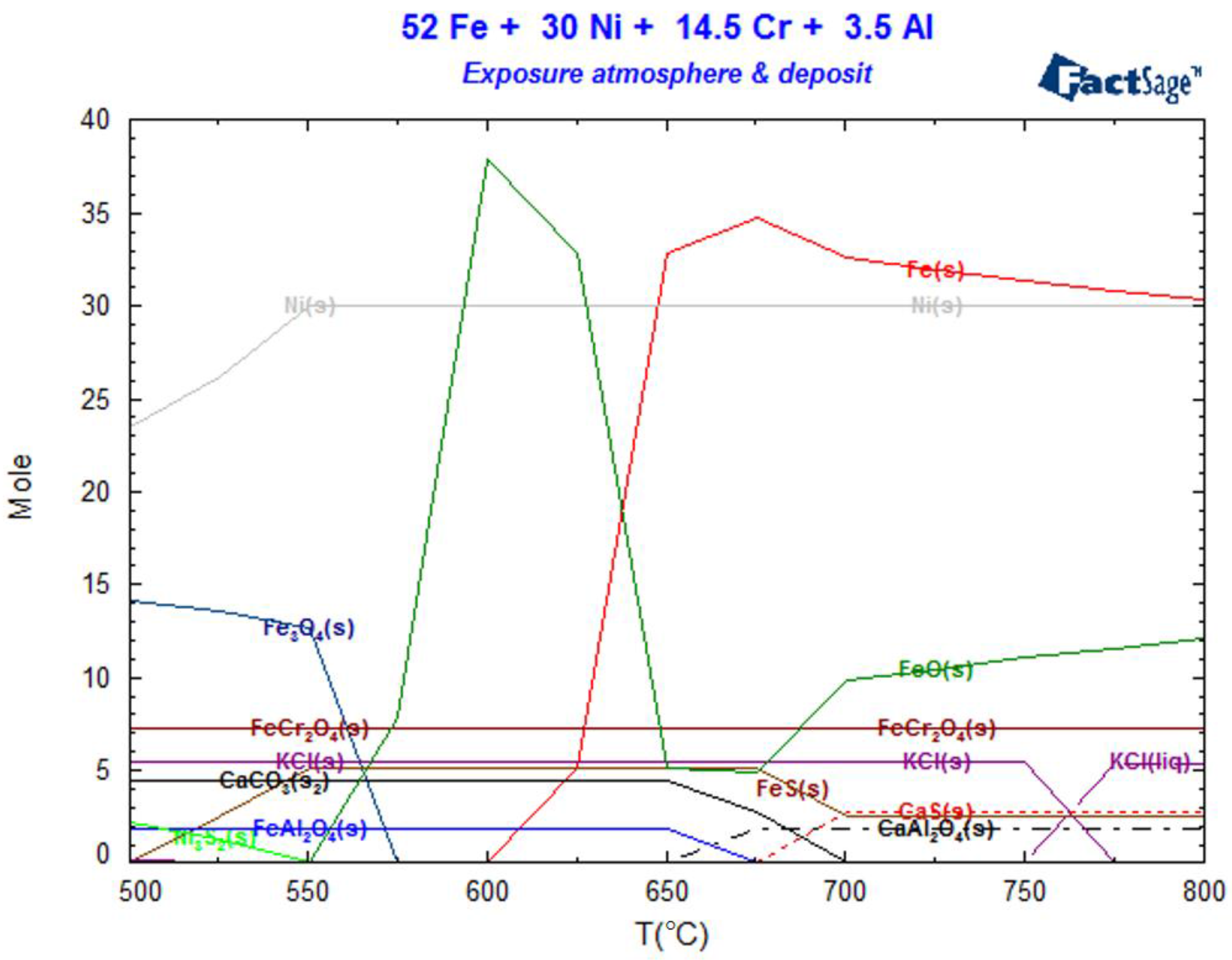Thermodynamic equilibrium calculations were made with a surplus amount of exposure gases (44% CO2-30% H2O-0.6% SO2-0.2% HCl-N2) and deposit (CaSO4-0.55 wt % KCl). The results are shown in Figure 2, where it can be seen that at 650 °C, the equilibrium favors solid FeCr2O4 formation along with smaller amounts of FeO, FeS and FeAl2O4 on top of Fe and Ni, which have high stabilities according to the calculation. The salt and gas would react to form solid CaCO3. Moving to 720 °C solid FeO is increasingly preferred while solid FeS is not. Solid CaAl2O4 should be formed instead of FeAl2O4 and solid CaS instead of CaCO3.
