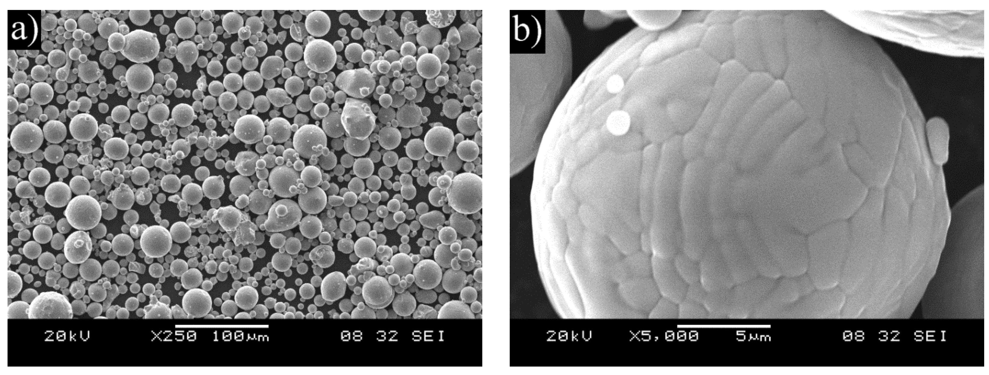 Figure 5. SEM images of gas atomized FeNiCrAl powder sieved 45–125 μm, magnifications with micron bars. (a) 100 μm; (b) 5 μm.