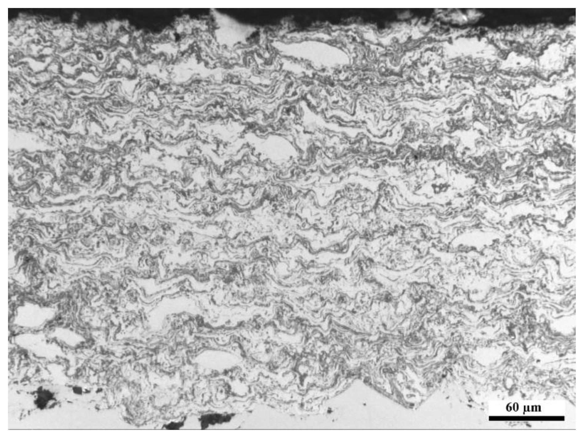 The DJ Hybrid sprayed FeCrNiAl coating had protected the X20 stainless steel substrate material during the 700 h exposure at 650 °C (Figure 8). Thick salt deposits had stuck on the coated specimen. Average outer corrosion product thickness on the deposit side was measured from the cross section to be 60 μm. The measurements were complicated by some corrosion products that had diffused into the deposits. In addition, there was 20 μm of internal corrosion in the coating.