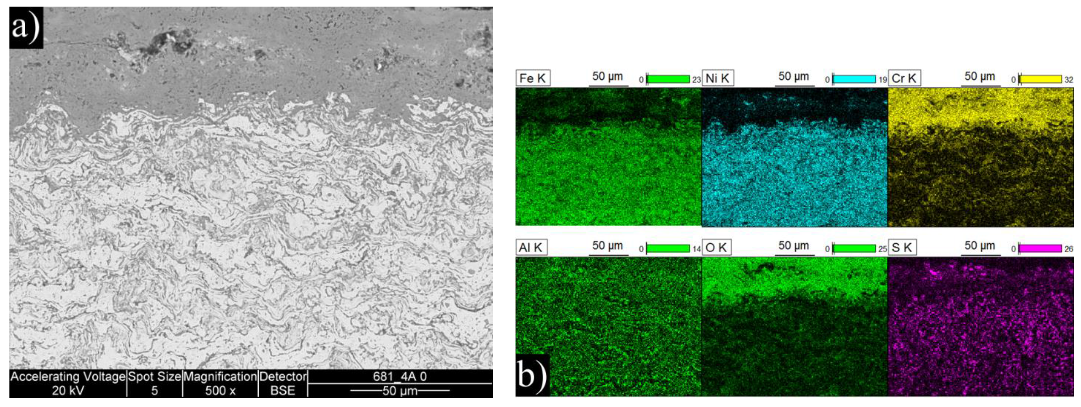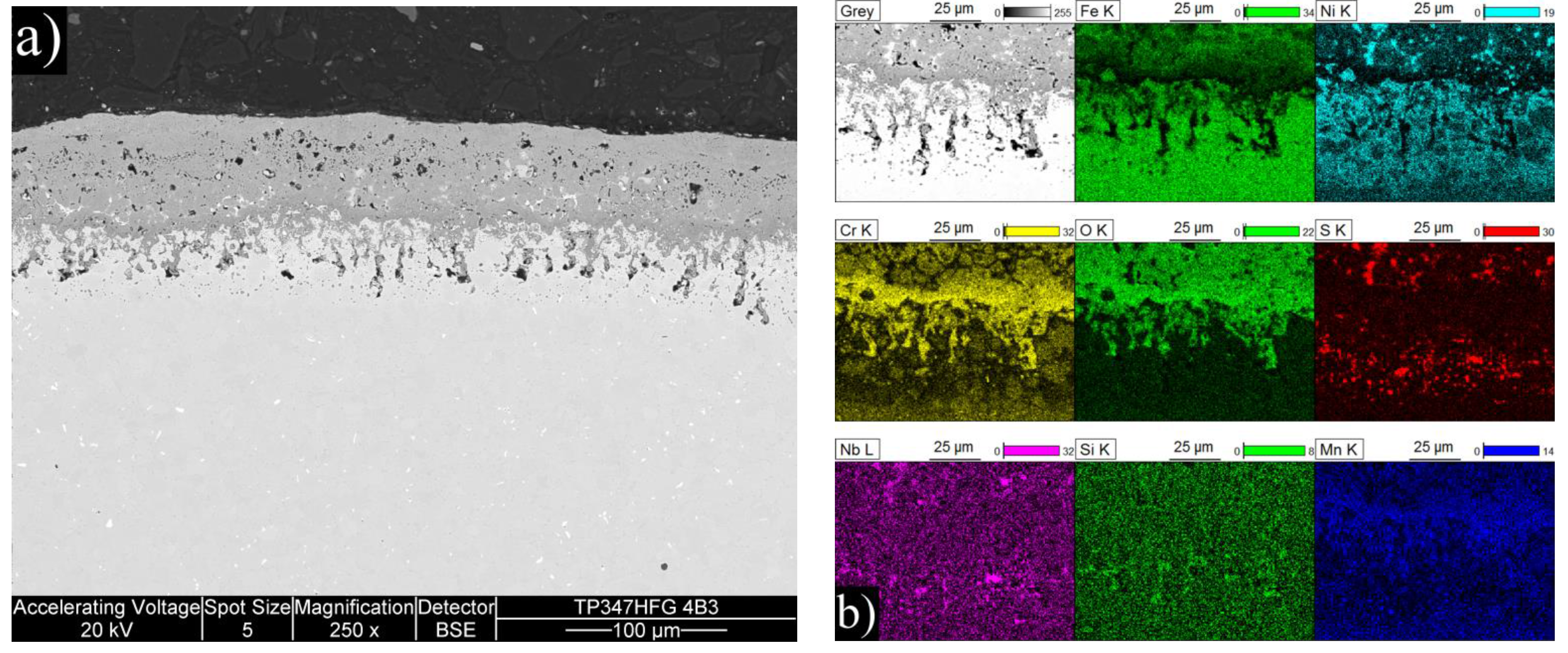 Figure 12. (a) SEM image of TP347HFG steel cross-section near the surface after the exposure at 720 °C for 1000 h; (b) EDX elemental map of the corrosion front at a higher magnification.