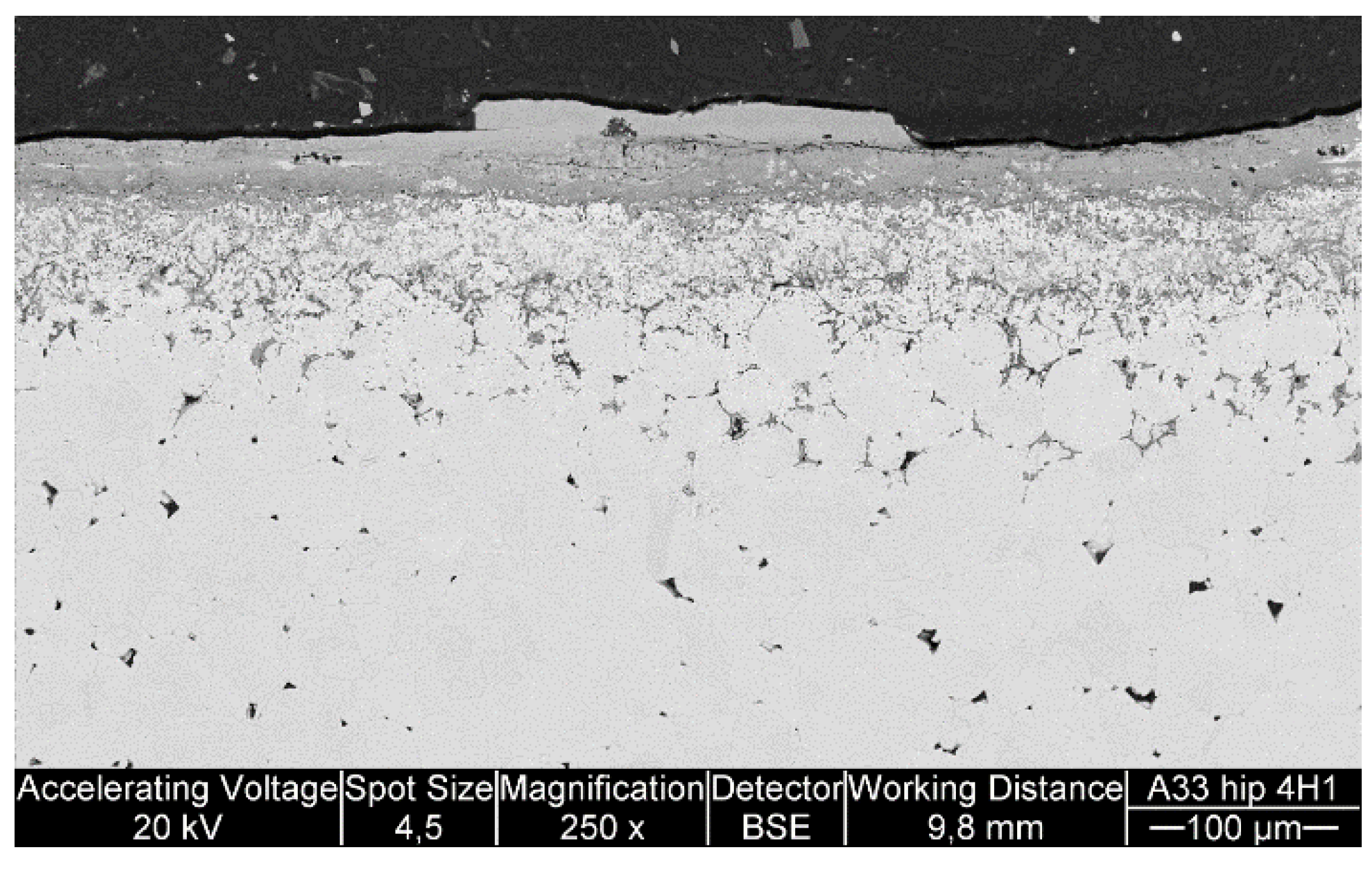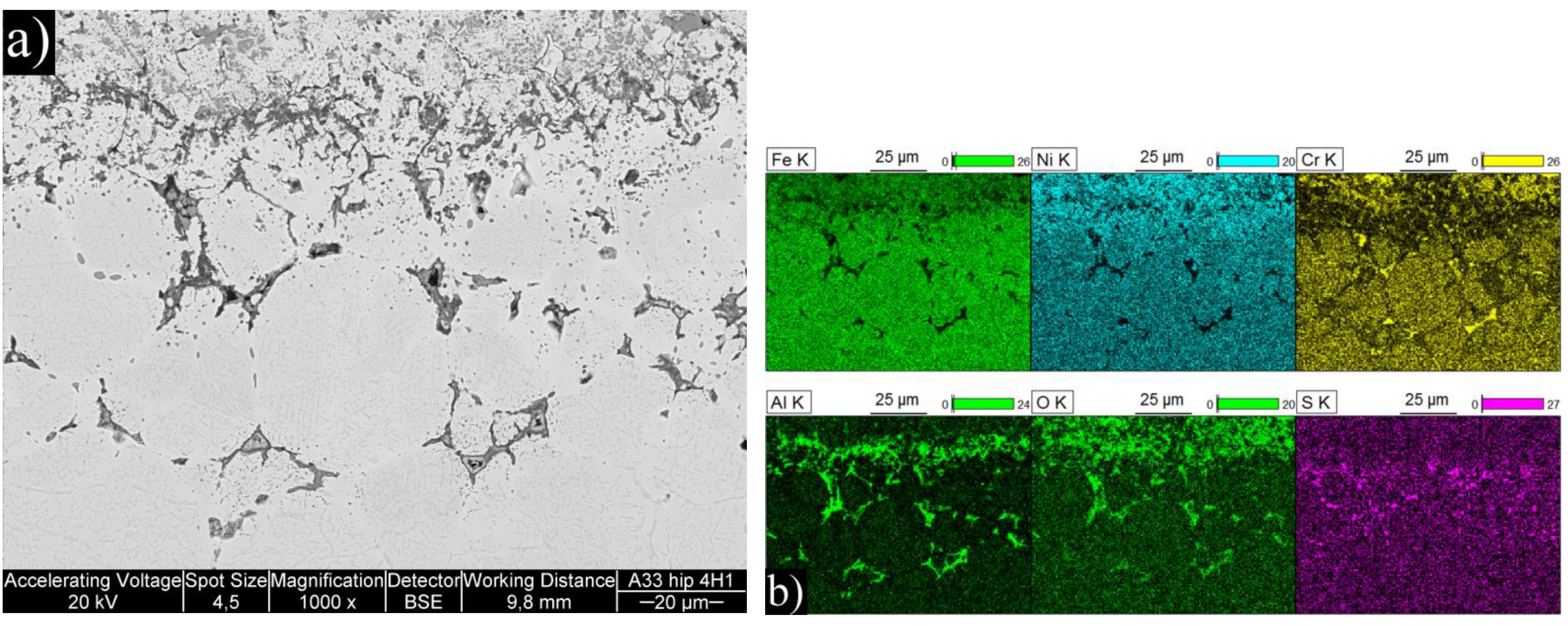 HIP’ed specimen exposed at 720 °C for 1000 h had corrosion products partially spalled off. There was from 30 to 50 μm of continuous corrosion layer left on the surface and internal corrosion from 50 μm up to a depth of 170 μm (Figure 10). The internal corrosion had first progressed through particle boundaries, some of which had clear gaps, and then through grain boundaries inside the particles (Figure 11a). EDX map (Figure 11b) shows that Cr was removed from particle boundaries where the corrosion progressed. Al was enriched at the particle boundaries and on top of the area where individual particles can still be distinguished. A Cr-rich layer was formed above the Al-rich layer.