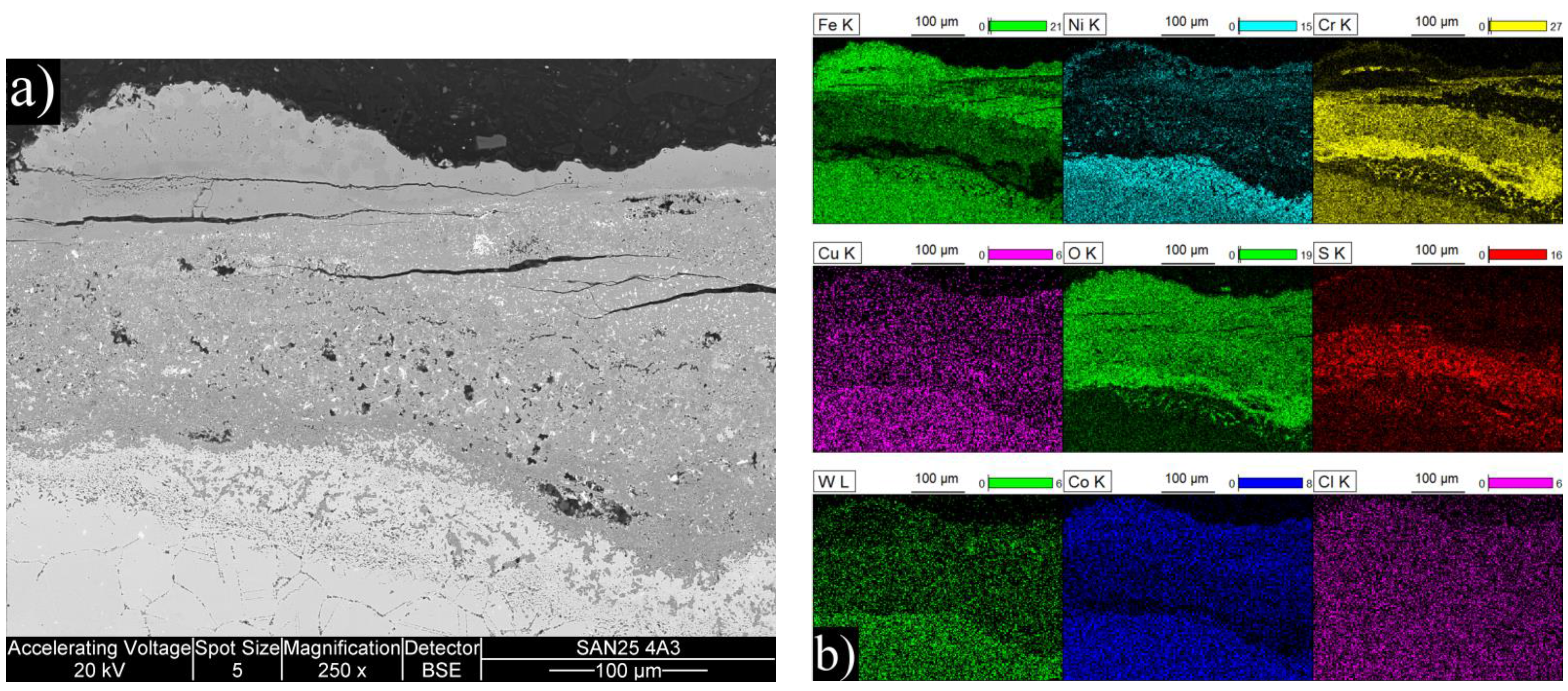 The bulk reference material TP347HFG had corrosion layer thickness of 100 μm on the surface after the 1000 h exposure at 720 °C (Figure 12). However, the outer layer of the oxide was detached. In addition, there was up to 100 μm of internal degradation. EDX analyses showed sulfur penetration through grain boundaries. Small and isolated Ni and Nb rich areas can still be observed within the oxide layer along with S at matching locations. Sanicro 25 (Figure 13) had 300 μm of corrosion products on the surface. However, some spallation had also occurred in this case. Internal corrosion for Sanicro 25 ranged from 300 to 500 μm. The corrosion front appears to be depleted of Cr, while Ni is enriched (Figure 13b). S and Cl traces were found at grain boundaries, which were the main route for corrosion. Table 6 summarizes all the corrosion layer thicknesses at 720 °C.