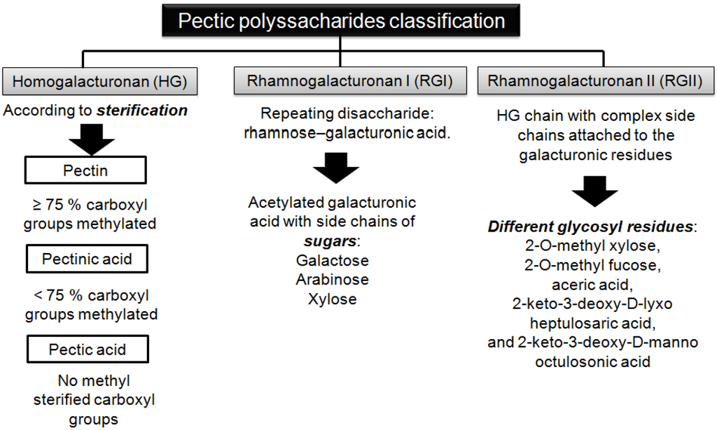 Pectic substances are present in the primary cell walls and middle lamellae of many plants and fruits, and they are frequently associated with cellulose, hemicellulose and lignin structures []. Their presence in the cell is important for some essential functions: (a) adhesion between cells; (b) mechanical strength of the cell wall; (c) ability to form stabilizing gels; and (d) they play a significant role in the growth of plant cells []. Pectin forms the most complex class of polysaccharides, mainly composed by high molecular weight heterogeneous groups of glycanogalacturonans and acidic structural polysaccharides with diverse structures. Pectin backbone consists of (1→4)-α-d-galacturonic acid molecules linked to a small number of rhamnose residues in the main chain and arabinose, galactose and xylose in the side chains []. Several authors stated that pectin polysaccharides can be classified in three types (Figure 1) [,,].