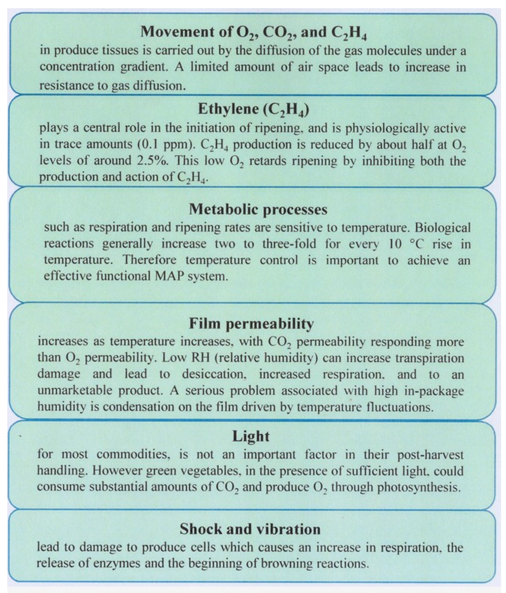 Low levels of oxygen and high levels of carbon dioxide reduce the produce respiration rate, delay senescence and, consequently, extend the shelf-life of fruits and vegetables. Once the package is closed, the composition of the gases inevitably changes due to produce respiration and the gas permeability of the film. If the oxygen levels are too low, fermentative processes are favored.