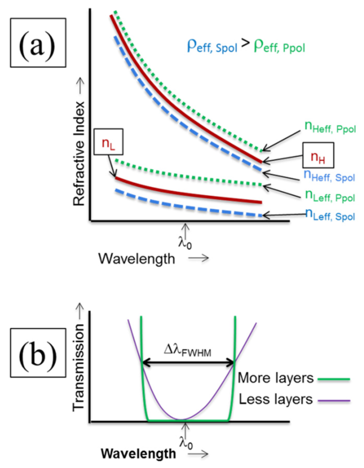 (a) Schematic depicting the dispersive variation with wavelength of the index of refraction and the effective for S polarization (Spol) and P polarization (Ppol) indices for non-normal angle of incidence (AOI) for the H and L index layers of a BBHR coating. See the text for explanation of the labels; (b) Schematic depicting two transmission spectra for a BBHR coating, one of more and the other of less layers, as indicated. λ0 is the center wavelength of the spectra. The bandwidth label refers to the BBHR counterpart to the bandwidth, ΔλFWHM, of quarter-wave HR coatings, for which ΔλFWHM/λ0 = (2Δg)/[1 − (Δg)2] where Δg depends on polarization and, for Spol(Ppol), is given by (2/π)sin−1[(ρeff,Spol(Ppol) − 1)/(ρeff,Spol(Ppol) + 1)] [13].