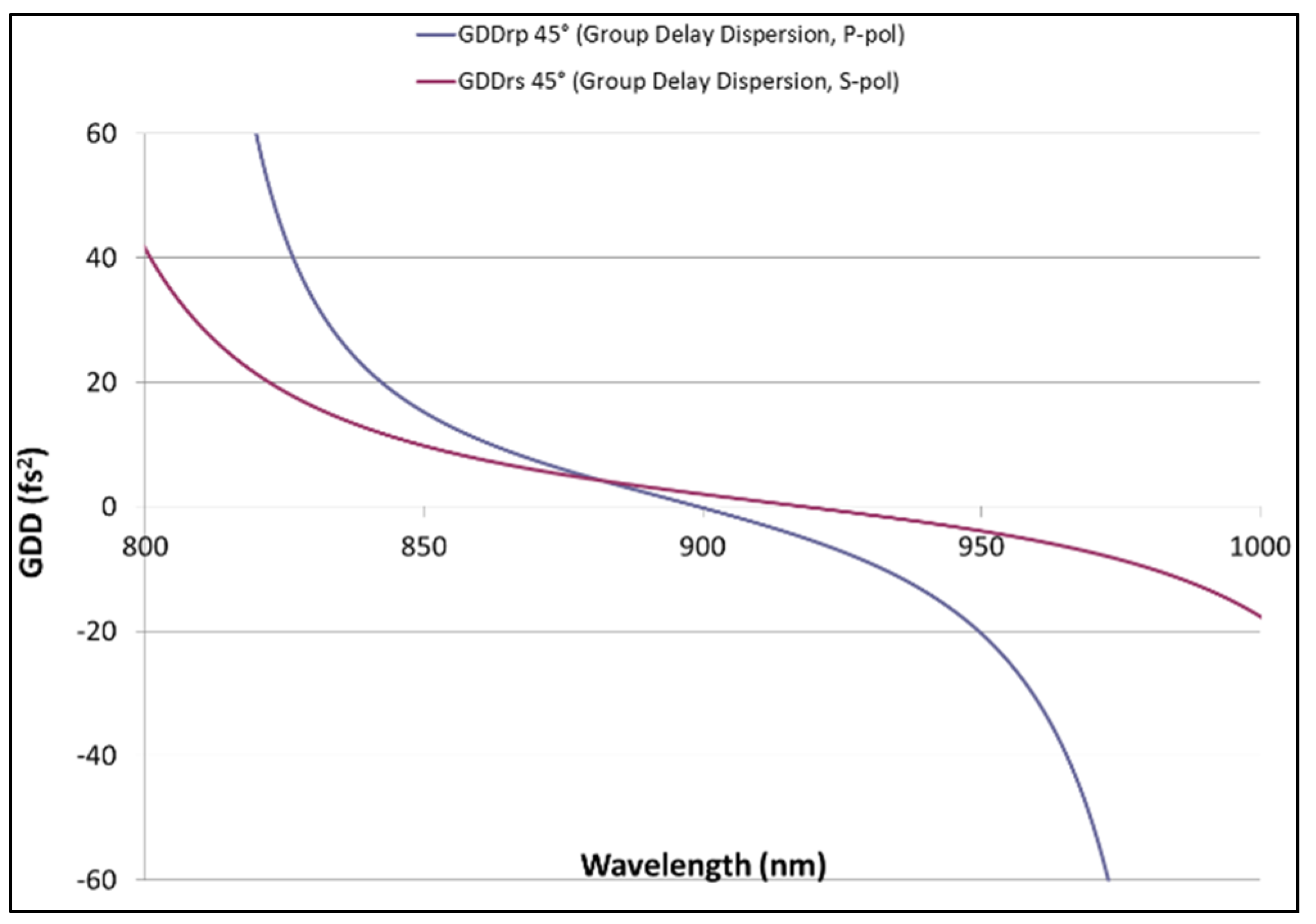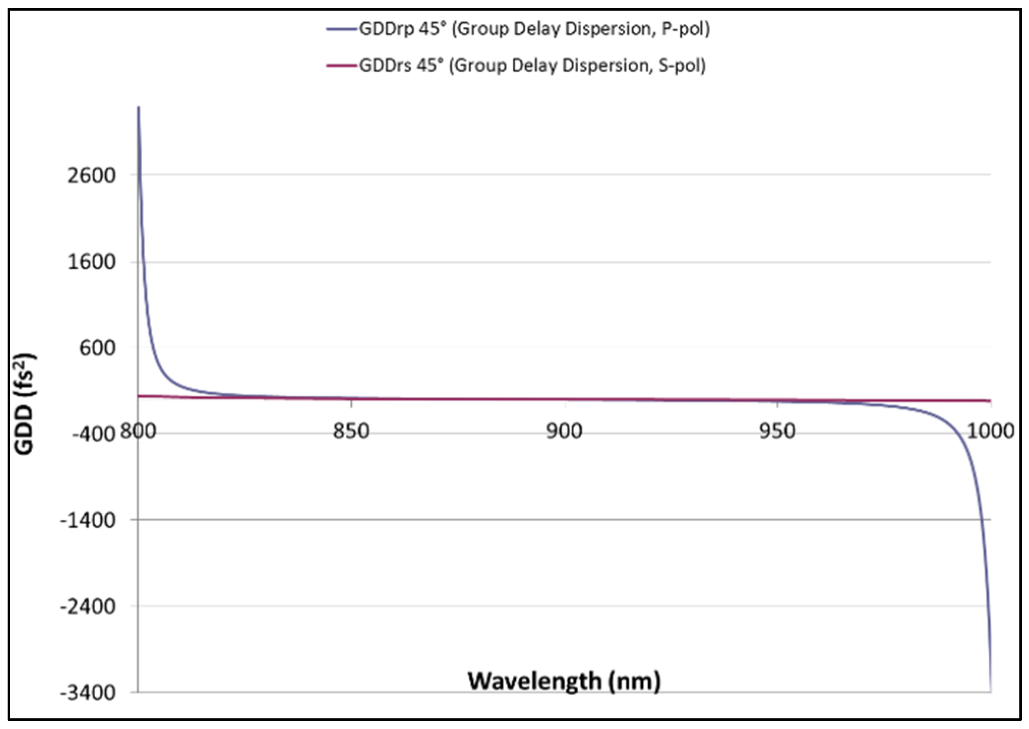 Figure 4 shows Ppol and Spol GDs based on our BBHR coating design over the operational bandwidth for reflection at 45° AOI. The GD variation with wavelength is very smooth overall and fairly flat, with the Ppol GD between ~6 and ~10 fs in the interval of 816–982 nm and the Spol GD between ~3 and ~7 fs over the entire operational band. Beyond the 816–982 nm spectral range for Ppol, the GD rises smoothly to ~35 fs at 800 nm, and to ~30 fs at 1000 nm. The corresponding GDDs are shown by Figure 5 and, on an expanded scale, by Figure 6. The GDDs are definitely not constant with wavelength but are within ±20 fs2 from 843 to 949 nm for Ppol, and from 822 to 1000 nm and beyond for Spol, and are within ±50 fs2 from 823 to 969 nm for Ppol, and over the entire operational bandwidth and beyond for Spol. GDD rises smoothly in magnitude as wavelengths approach the low and high wavelength extremes of the operational band. For Ppol, GDD rises smoothly from 50 fs2 at 823 nm to ~3500 fs2 at 800 nm, and drops smoothly from −50 fs2 at 970 nm to −3500 fs2 at 1000 nm. Because of this smooth variation with wavelength of GD and GDD, the prospect of being able to compensate for large GDD (such as >20 fs2 or >50 fs2) where it occurs over the operational band is promising.