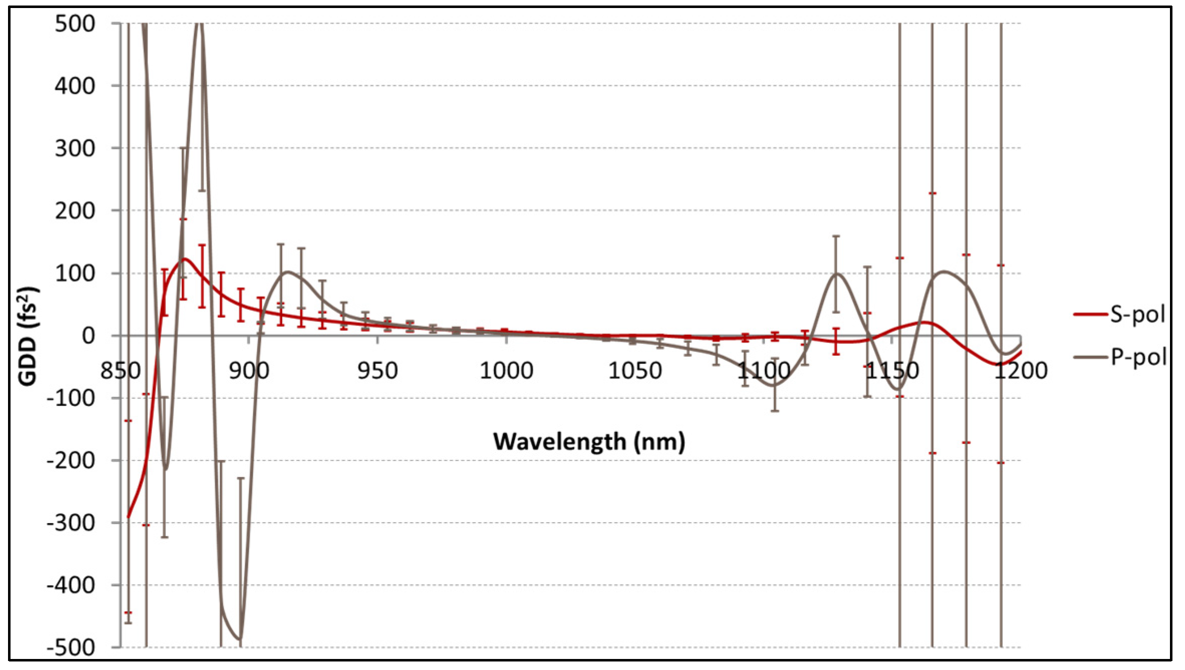 Measured GDD as a function of wavelength for reflection at 45° AOI, Ppol and Spol, for the initial BBHR test coating.