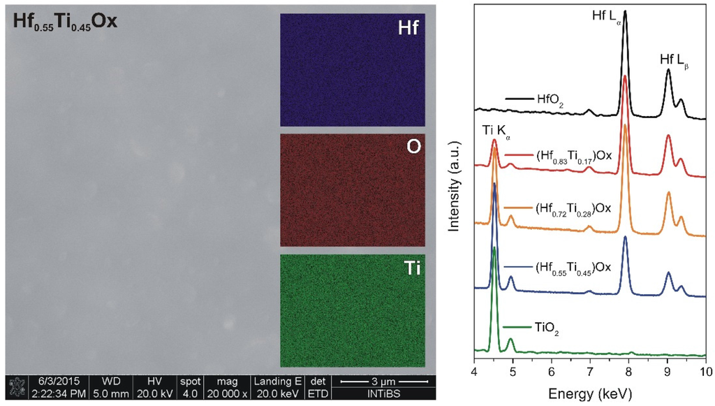 Secondary electron image showing Hf, Ti and O elements distribution in the (Hf0.55Ti0.45)Ox thin film and EDS spectra of as-deposited HfO2, mixed HfO2-TiO2 and TiO2 thin films