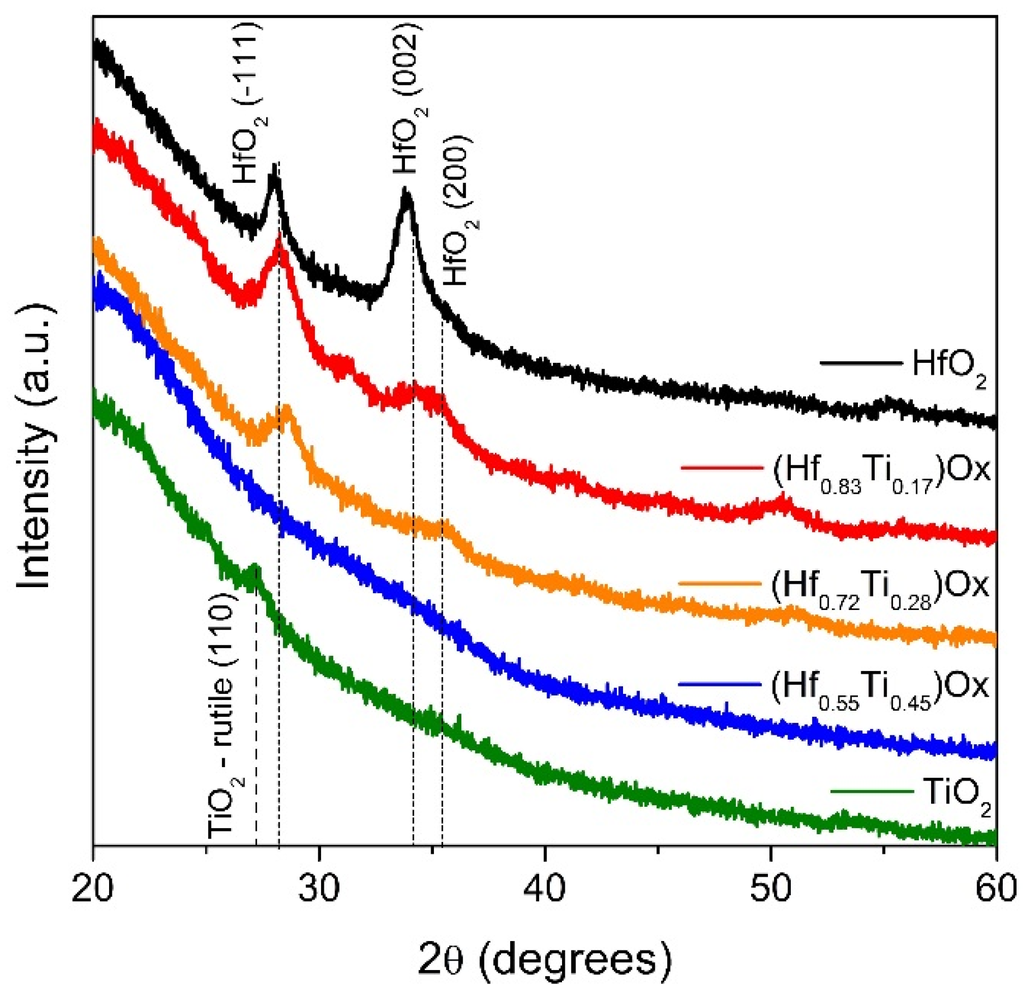 X-ray diffraction (XRD) measurements results of HfO2, mixed HfO2-TiO2 and TiO2 thin films.