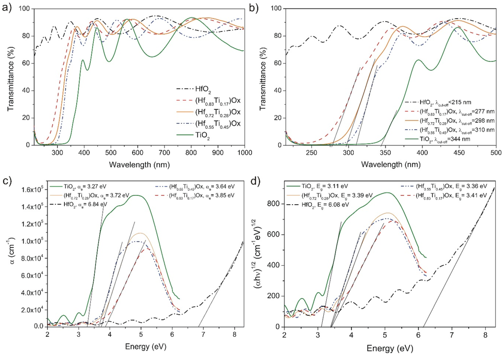 Optical properties such as cut-off wavelength (λcut-off) and optical band gap energy (Eg) were determined based on transmission spectra measurements in the range from ca. 200 nm to 1000 nm. The results of these measurements and analysis are presented in Figure 4. All as-deposited thin films were transparent in the visible wavelength range with the transmittance level of approximately 80%–90%, depending on the content of titanium. The highest average transmission was exhibited by pure hafnium, while the lowest (with the largest amplitude of optical interferences) was obtained for undoped titanium.