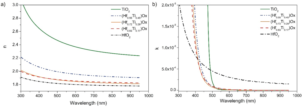 In Figure 5, the spectral characteristics of the refractive index (n) and extinction coefficient (k) are presented. For the calculation of n and k dispersion curves, the reverse engineering method was used with the aid of SCOUT software [37]. Additionally, the thickness of each of the samples was also estimated. TiO2 and HfO2 thin films were sputtered from single Ti or Hf metallic targets. Their thickness was similar and equal to 359 nm and 371 nm, respectively. Thin films of mixed HfO2-TiO2 coatings were sputtered from two independently powered targets, and the thickness of Hf0.83Ti0.17Ox, Hf0.72Ti0.28Ox and Hf0.55Ti0.45Ox was equal to 453 nm, 472 nm and 526 nm, respectively.