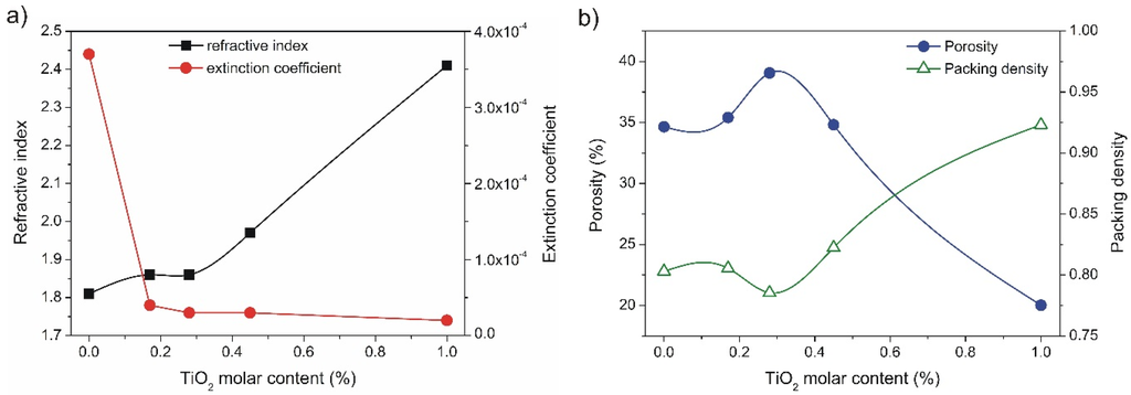 Dependence of: (a) refractive index and extinction coefficient; (b) porosity and packing density on TiO2 molar content.