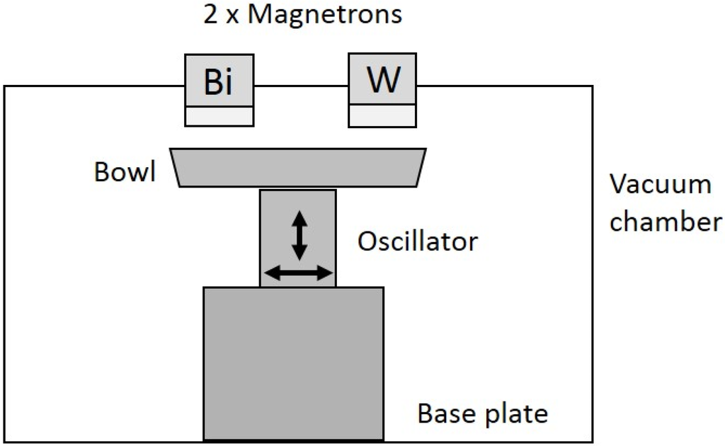 The oscillating mechanism used to manipulate the powder came from a vibrating bowl feeder system designed to feed small components from a bowl, around a spiral track at the edge of the bowl and out onto a production line. The original bowl was replaced with a plain flat bottomed bowl of 450 mm in diameter positioned under a pair of co-planar magnetrons which enabled sputtering from two targets (Bi and W in our case) simultaneously. The charge of powder is placed in the bowl and the whole assembly was installed in the vacuum chamber directly underneath the magnetrons, giving a target to substrate separation of 120 mm. This arrangement is shown schematically in Figure 1. The bowl oscillates vertically at 50 Hz, but springs connected between the electromagnet and the base plate are designed to also impart a lateral twisting moment to the oscillation. The resulting motion causes particles in the bowl to roll or hop in a circular path around the bottom of the bowl and, thus, over time all surfaces of the particles are exposed to the coating flux. Coating uniformity and thickness are functions of run time, target power and deposition rate (material arrival rate parameters), particle size and shape, and the charge of powder in the bowl (surface area parameters). This system is distinctly different to those reported elsewhere, since the particles in our system are not only oscillated vertically, but also tumble horizontally around the bowl.