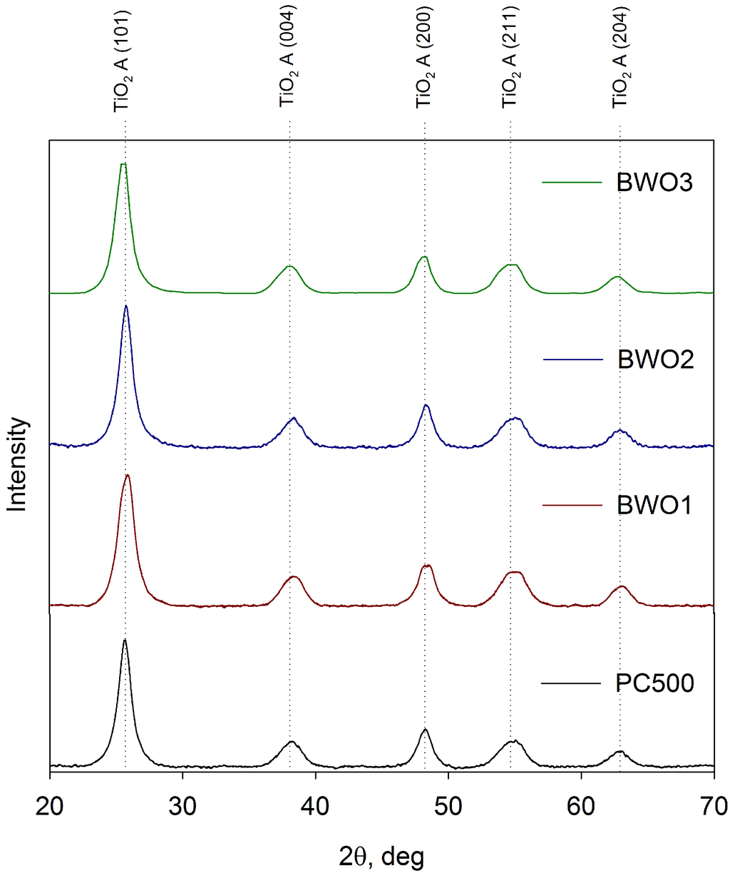 The XRD spectra of the coatings are given in Figure 3. It can be seen that only peaks corresponding to the anatase TiO2 appear on the spectra (JCPDS: 21–1272). This is most likely due to the fact that the content of bismuth tungstate is rather low, and it is under the sensitivity threshold of XRD. No significant changes in crystallinity of TiO2 occurred after deposition of bismuth tungstate, with (101) remaining the predominant crystal plane. Broad diffraction peaks were observed, which is evidence that that crystal grains are in the nanoscale range. Crystallite sizes listed in Table 1 were estimated using the Scherrer equation and varied in the range 7–10 nm (as given in Table 1). Crystallite sizes did not change significantly with bismuth tungstate deposition, however it should be noted that they were calculated based on the anatase (101) titania peak only, therefore these values are given here just for estimation purposes.
