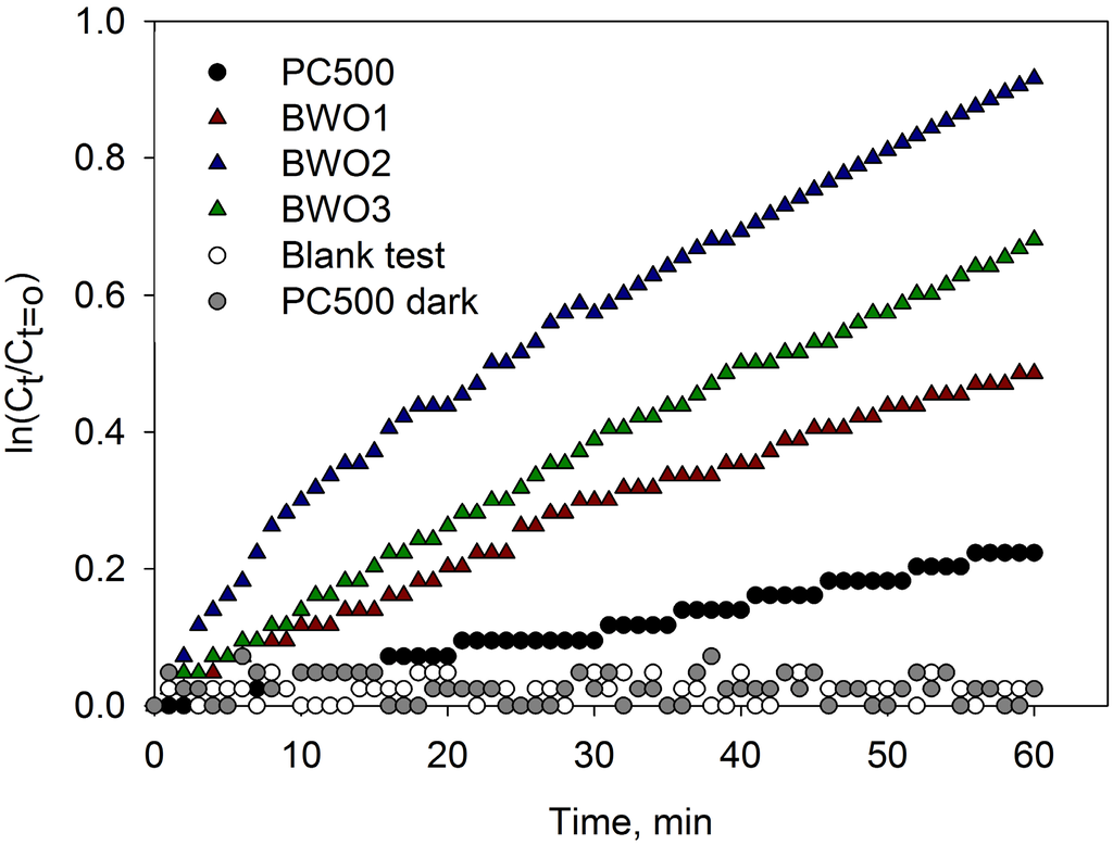 It is clear from Figure 6 that the deposition of bismuth tungstate onto titanium dioxide particles significantly increased photocatalytic activity under visible light. Not surprisingly, the photocatalytic activity of PC500 titania in this case was very low, due to the relatively high value of its band gap. Of the samples studied, the highest level of activity was recorded for the coating BWO2, nevertheless the band gap value of this sample was not the lowest of those tested here. The lower photocatalytic activity of sample BWO3, despite its lower band gap, can possibly be explained by the presence of amorphous tungsten in this tungsten-rich sample, which could inhibit the photoactivity [].