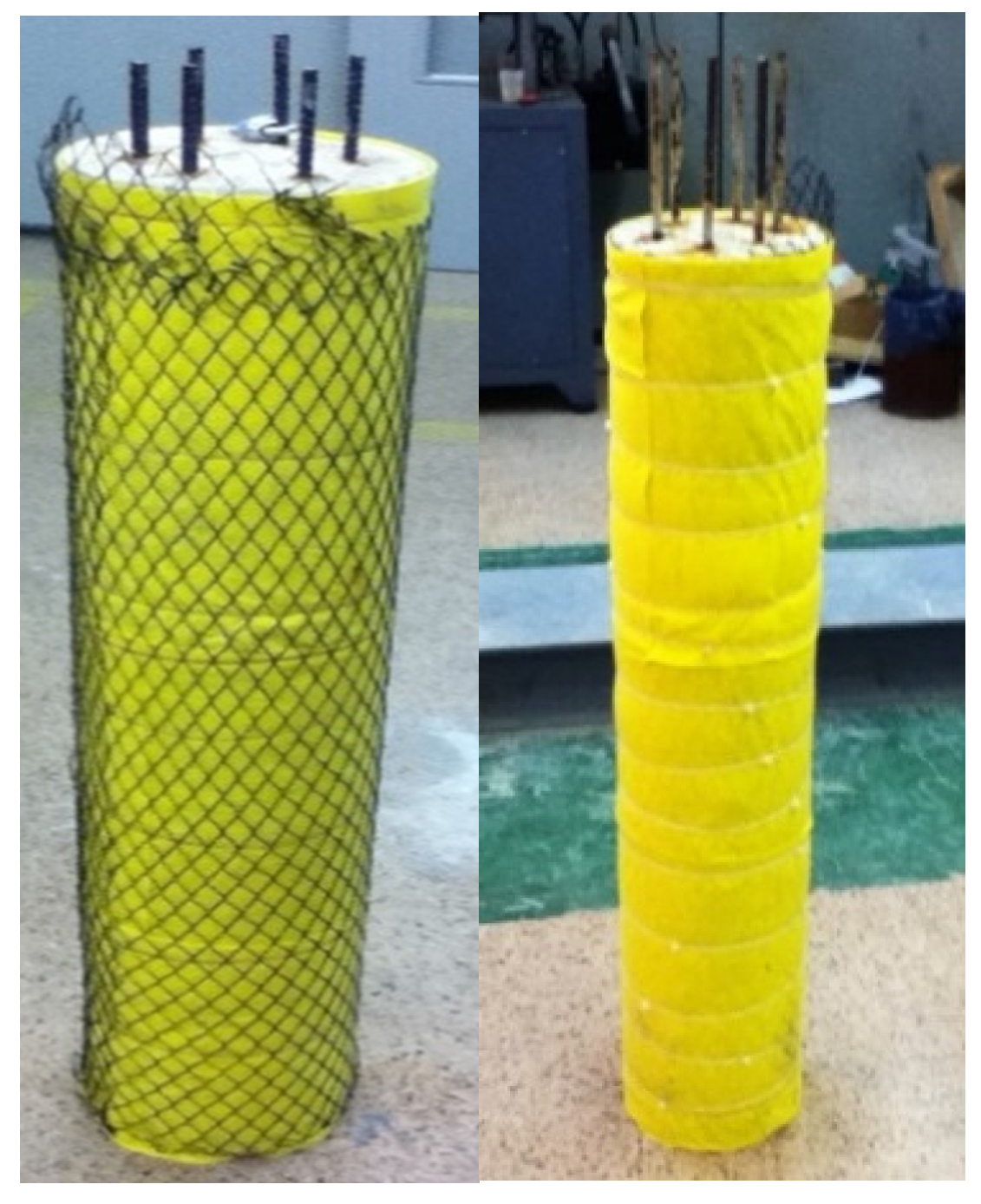 For Case Studies 1 and 2, reinforced concrete laboratory specimens were molded as structural supports 1 m long; three of them had a cylindrical shape with 200 mm diameter, and another three were 200 × 300 mm2 prisms. The cylindrical ones were reinforced with six longitudinal rebars of 8 mm diameter, hexagonally arranged, including three stirrups of 6 mm diameter, uniformly distributed. Regarding the prism shapes, the reinforcement was composed of four rebars of 16 mm diameter located in the corners and four stirrups of 8 mm diameter. In all cases, concrete cover was 40 mm thick. Concrete had a composition as shown in Table 1. The water/cement ratio (w/c) was 0.6, higher than usual in construction [28]. The reason is to obtain a porous concrete, in order to make easier the ionic transport across the concrete mass, evidencing in a clearer way the ECE efficiency difference between both types of anode systems. In order to simulate a serious Cl− contamination, 3.3% NaCl was added to the mixing water. Thus, the concrete contained 2% of Cl− relative to cement mass.
