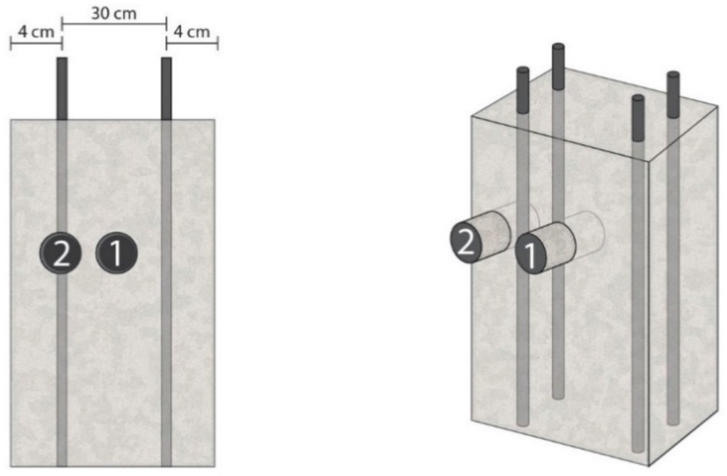 Extraction of two different concrete core samples on prismatic reinforced concrete specimens (Case Study 2). Point 1 is on the center of the biggest face of the specimen, and point 2 on the concrete cover, over the steel bar. Adapted from [24].
