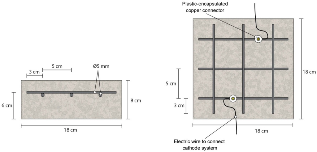 Sketch of reinforcement of samples and connection of the cathodic system for the specimens tested in Case Study 3. Adapted from [27].