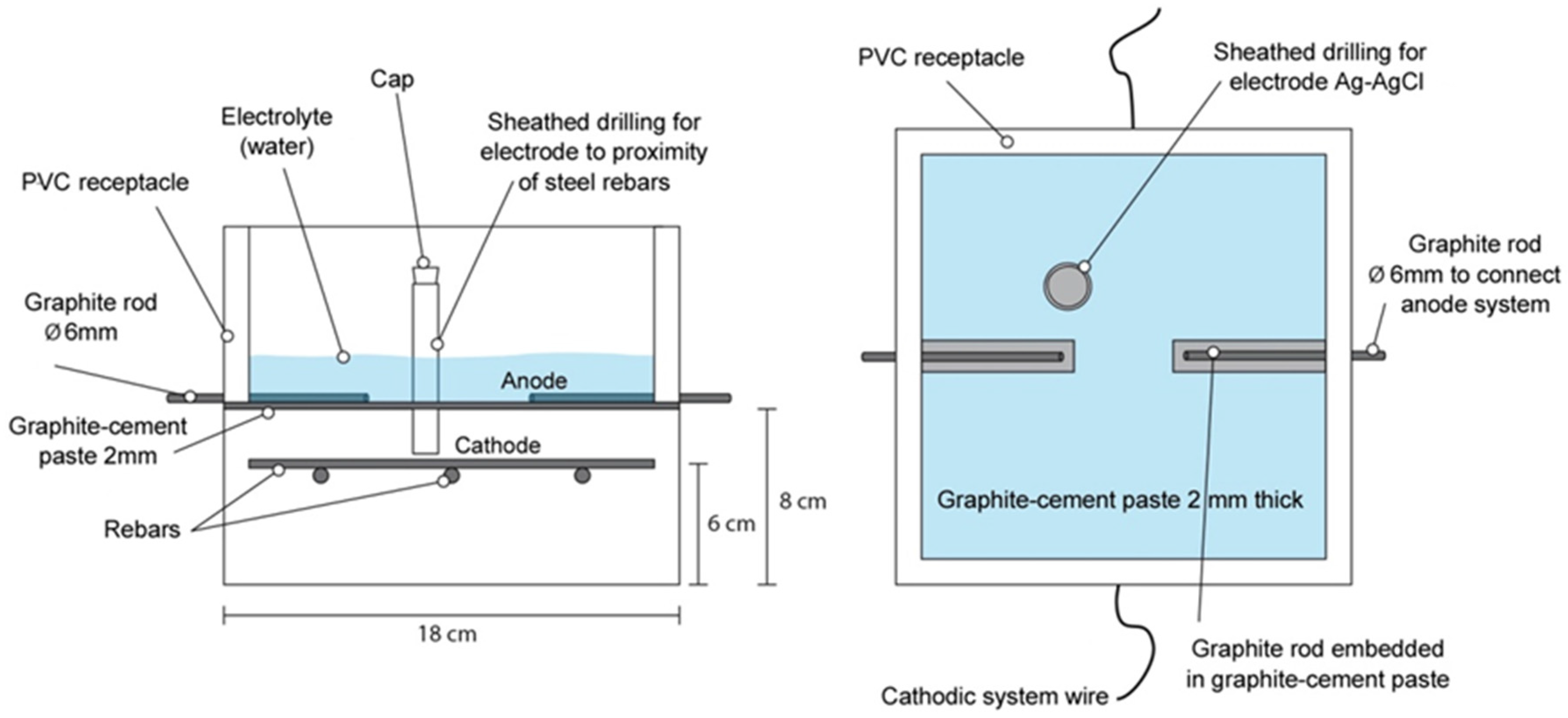 All the electrochemical tests in this section were performed using the GCP anodic overlay. To form the anode system, a graphite–cement paste was prepared by mixing graphite powder and Portland cement at 50%/50% in mass. The water to solid mix ratio was 0.8. Secondly, a 2 mm thick layer of this paste was applied on the surface of each specimen, and then all of them were moist-cured for 10 days. After that, two grooves were performed lengthwise onto the anodic overlay, without reaching the concrete surface, in order to allow both graphite rods to connect to the positive pole of the electric source. To finish up, these rods were overlaid with graphite–cement paste in order to join with the anode system perfectly, but avoiding any contact between graphite rods and concrete. A PVC receptacle was assembled on top of the samples to retain both ECE electrolyte (distilled water) and/or the dissolution used during CP or CPrev applications to simulate a continued chloride contamination (65 mL NaCl 0.5 M applied weekly), Figure 4. The ratio between the surface of concrete covered by the anodic overlay and the surface of the primary anodes (graphite rods) was 9.6; the ratio between the surface of concrete covered by the anodic overlay and the total surface of the steel bars was 1.7 (Figure 4). All current density and electric charge density values reported in this work are relative to the surface of concrete (equal to the anode surface) unless otherwise stated.