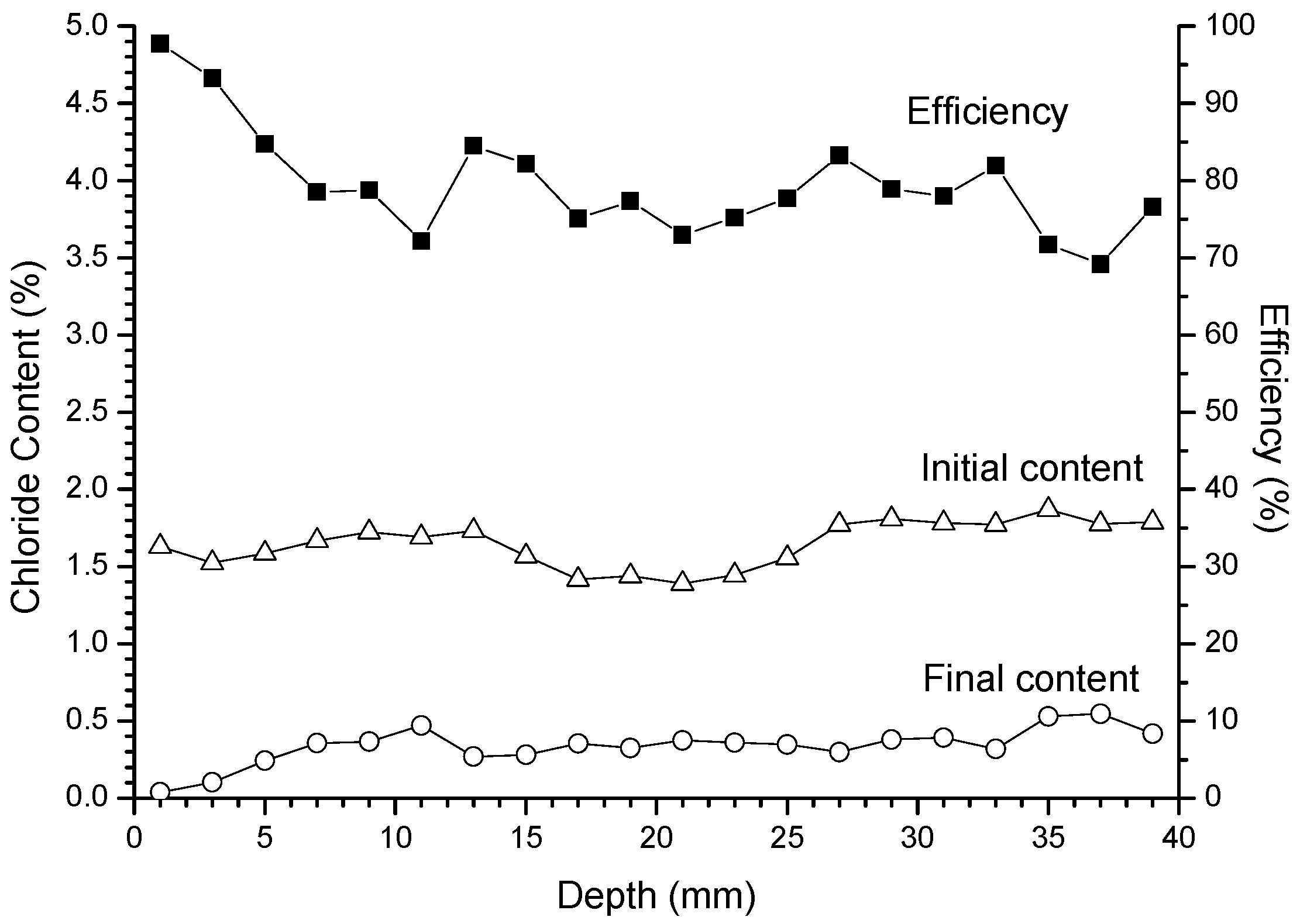 The ECE efficiencies were calculated as the percentages of reduction of the initial chloride content. The obtention of chloride content profiles before and after the ECE trials allows for calculating the local and overall efficiencies. The Cl− profiles were obtained following RILEM’s recommended procedures [36]. Cylindrical concrete cores, 95 mm diameter and 40 mm height (up to the rebar depth), were extracted before and after the ECE treatments. From these cores, concrete dust samples were obtained by grinding thin (2 mm thick) successive parallel layers to the exposed surface [36]. In this way 20 concrete dust samples were gained from each core, thus allowing the obtention of sufficiently detailed chloride content profiles. The determination of the samples’ acid soluble chloride contents was carried out by potentiometric titration [37,38]. All the chloride content values are expressed in this work as % Cl− relative to cement mass.