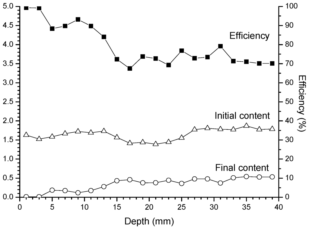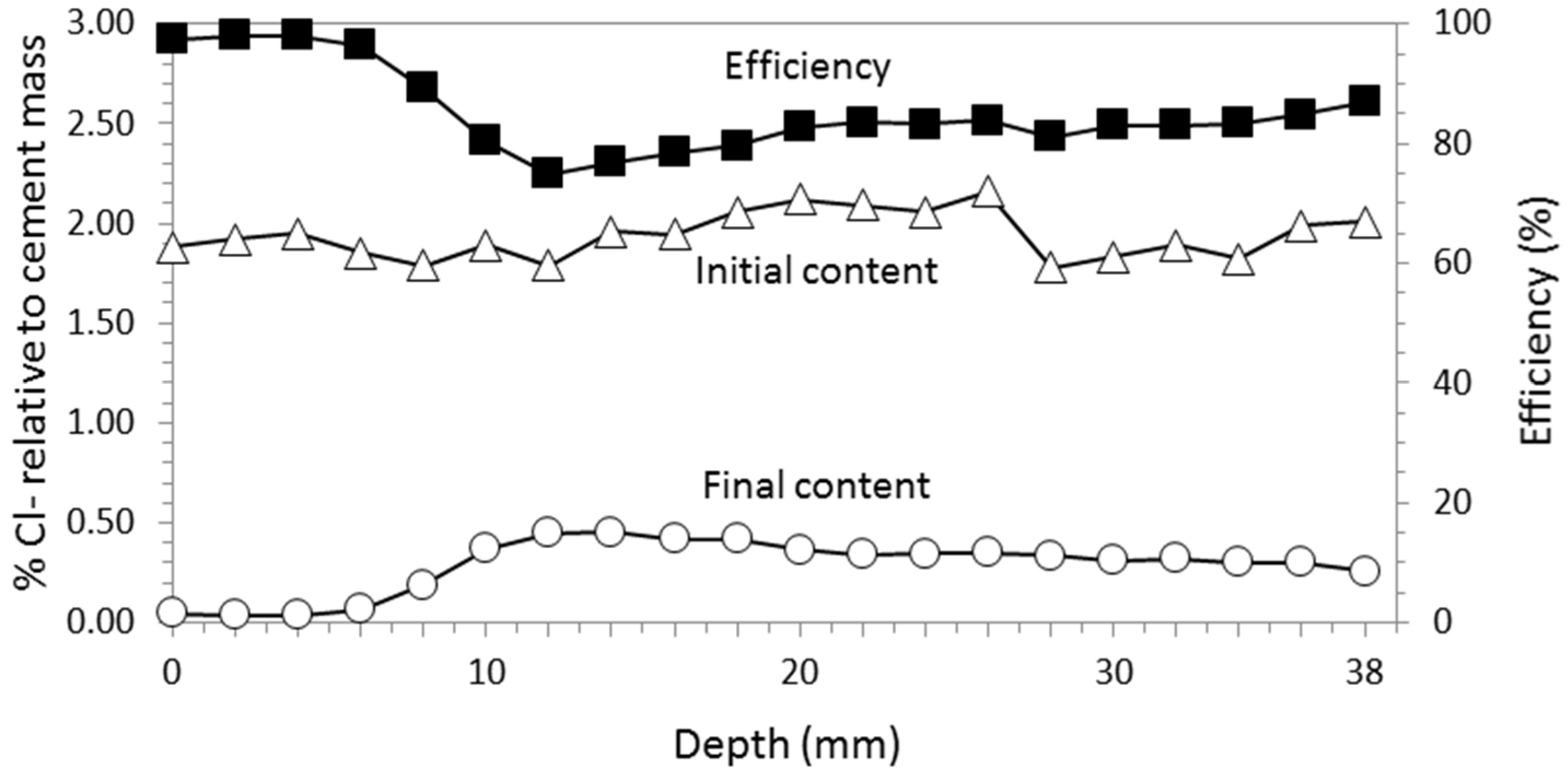 ECE with Ti-RuO2 anode. Rectangular section reinforced concrete specimen. Core extracted in the cover zone over the steel (position 2 in Figure 2). Cl− content profiles before and after ECE and distribution of local ECE efficiencies. Adapted from [24].