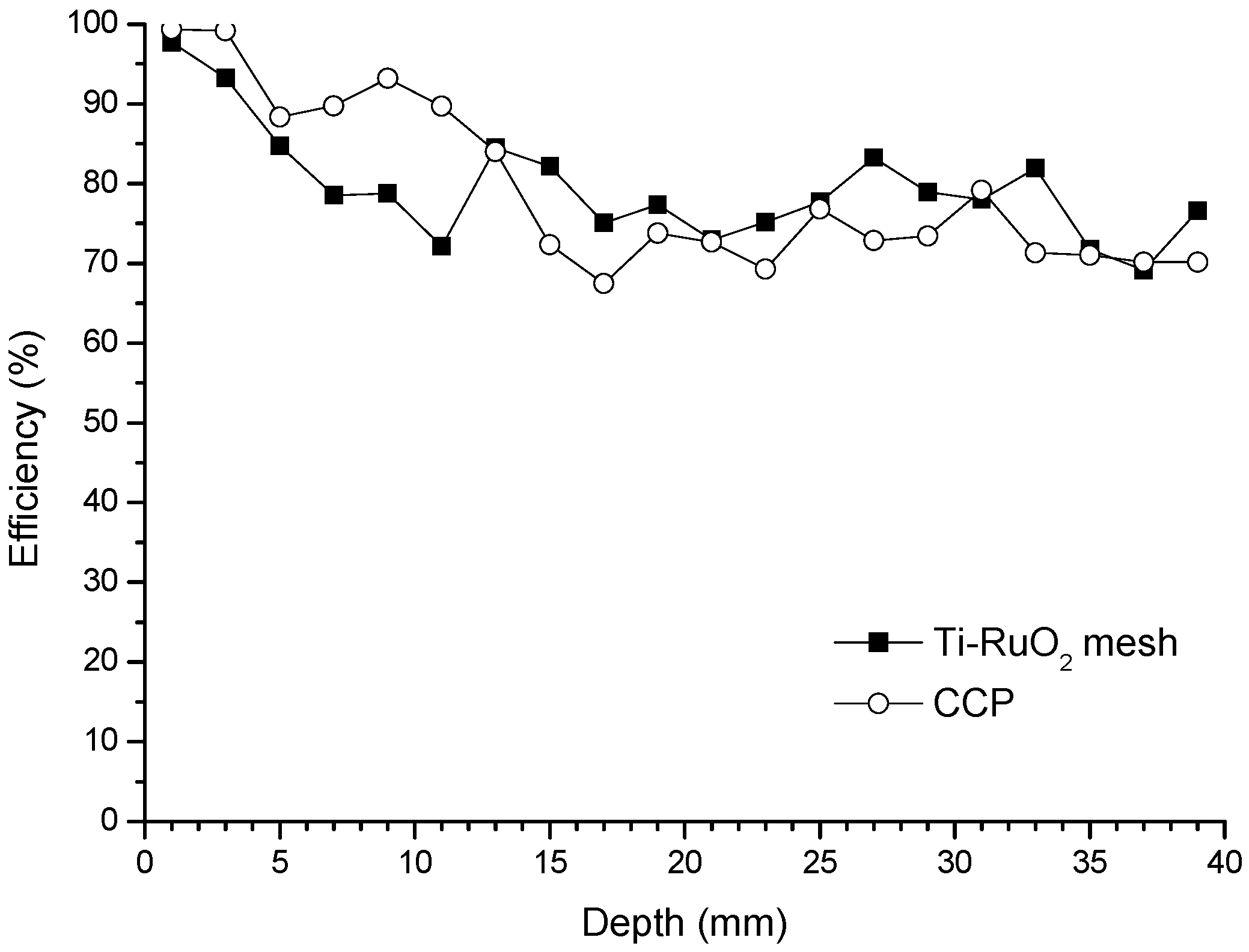 This section describes the results obtained in the experiments carried out to compare the ECE efficiencies obtained with the GCP anodic overlay and the classical Ti-RuO2 mesh anode, in terms of percentage of reduction of the initial Cl− content; refer to Section 2.1.