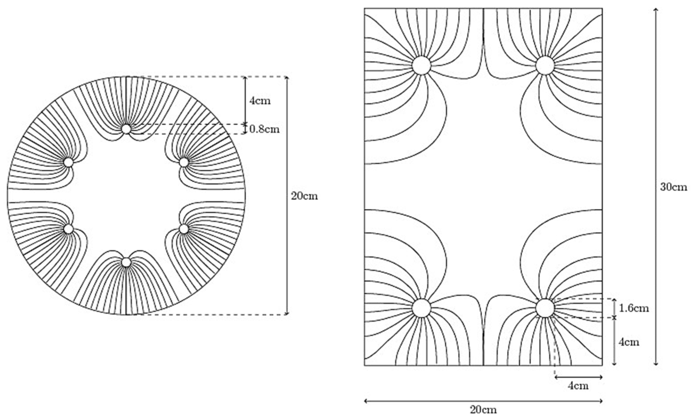 In 1998 Tritthart [3] applied the concept of electric flow produced during ECE to predicting differences in the local efficiencies of ECE, due to the lack of homogeneity in the intensity of the electric field acting between the steel rebar and the external anodes. This has some consequences regarding the practical application of ECE to reinforced concrete elements. Specimens of circular section with a regular rebar distribution, coupled with an anode with a symmetric concentric distribution, can provide an isotropic electric field for the ECE treatment. Conversely, the more habitual geometry and heterogeneous rebar arrangements of rectangular section reinforced concrete elements may produce local differences in the electric field intensity between different zones of the surface of the concrete structure, thus leading to differences in the ECE efficiency (Figure 8). The aim of this section is to provide further quantitative experimental confirmation of these statements, and to evaluate the influence of the type of anode on the abovementioned anisotropic effect caused by the typical rebar arrangements in reinforced concrete elements [24]. To this end, chloride content profiles were determined both before and after ECE for reinforced concrete elements of circular sections (isotropic electric field), and rectangular sections (anisotropic electric field). For the latter, different sampling positions were selected in order to prove the mentioned effect. (Refer to Figure 2 in Section 2.1.).