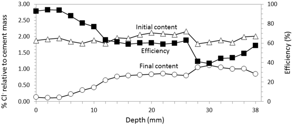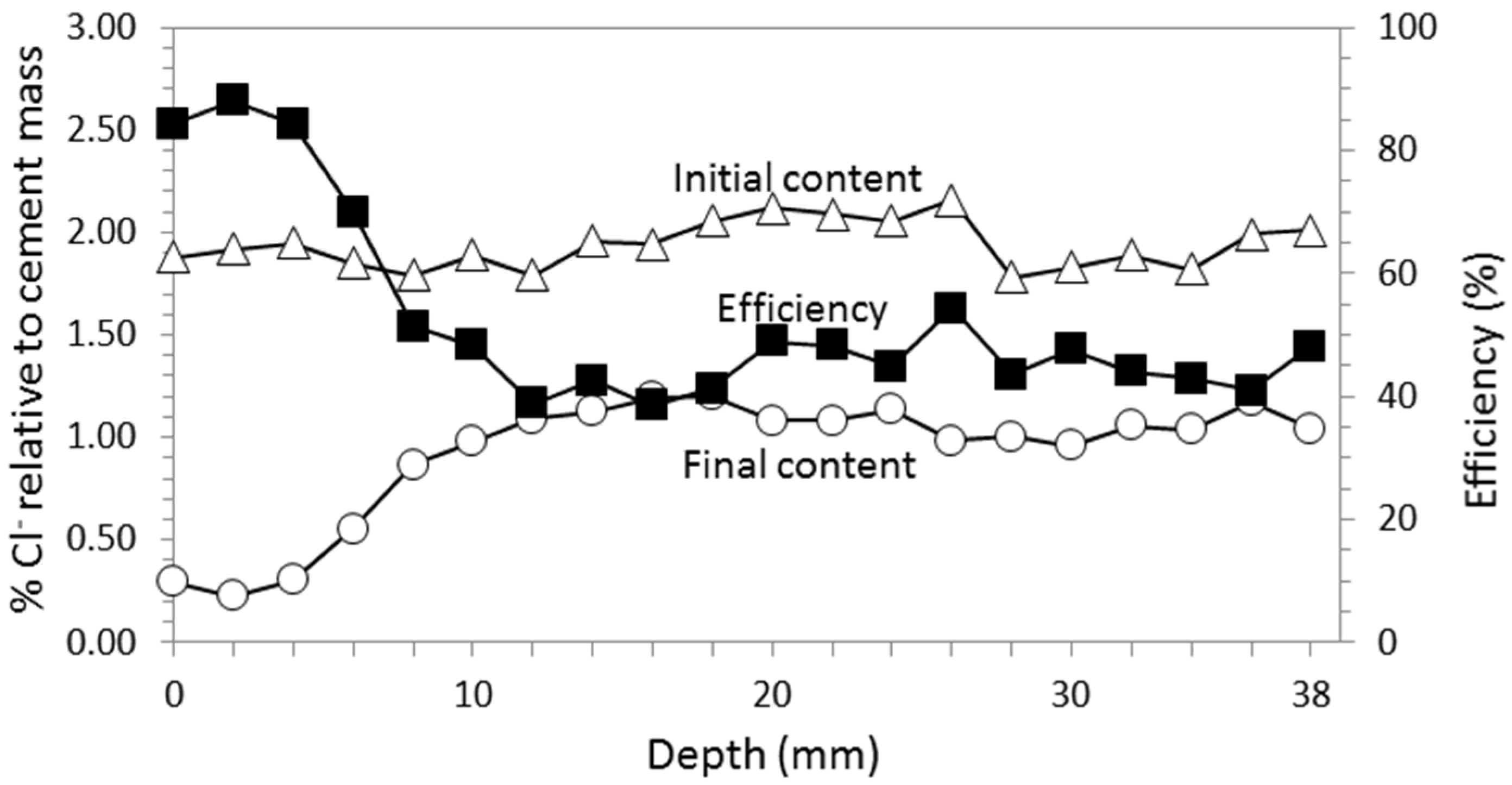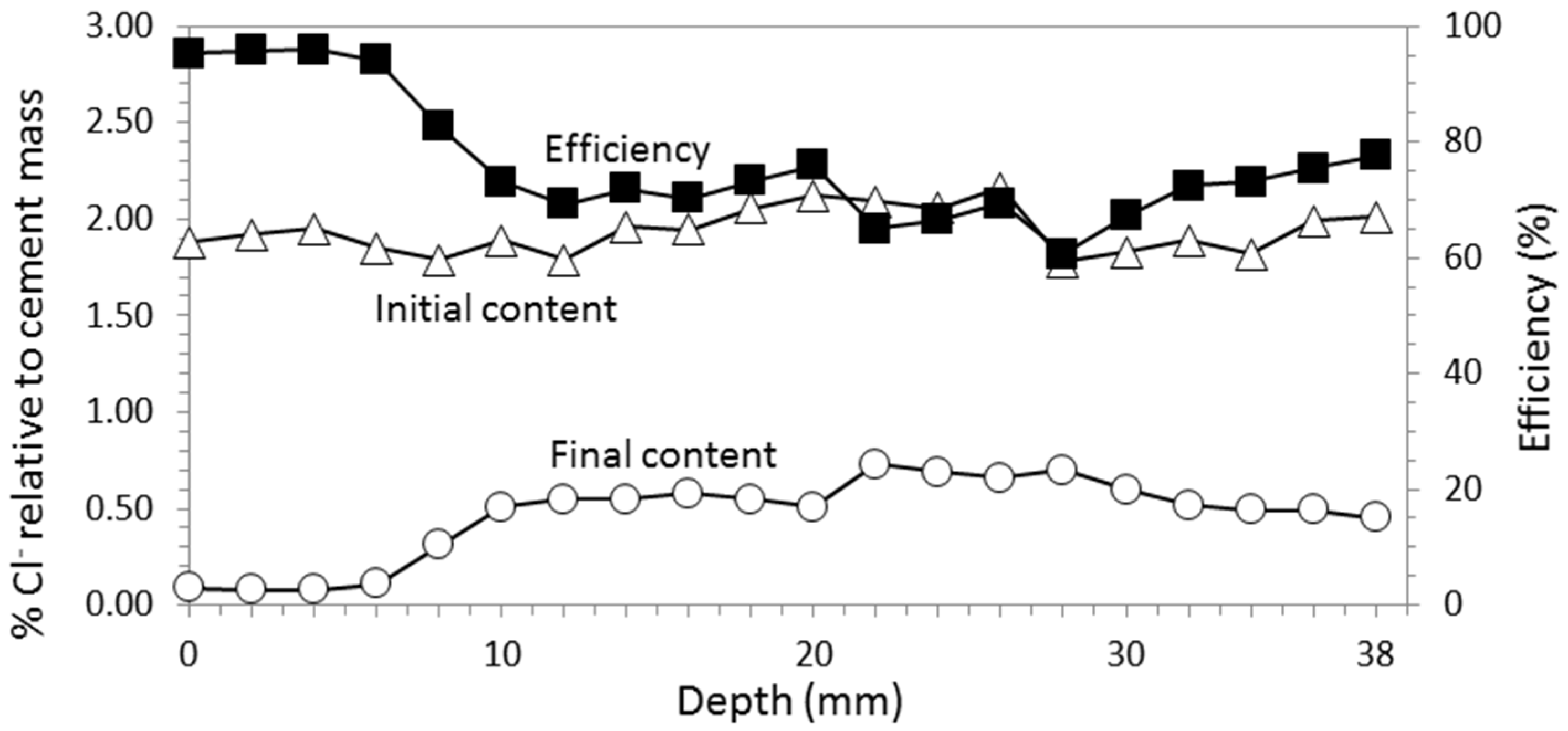 Chloride content profiles and ECE efficiencies using the reference anode system based on a Ti-RuO2 mesh. Adapted from [22].