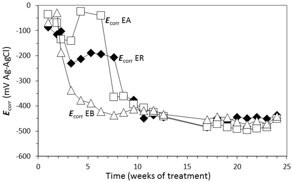 For the three specimens previously treated with ECE, Figure 13 shows that the initial Ecorr values were equal or higher than −100 mV, typical values of steel corrosion potentials after ECE [6]. The Ecorr values of EB (ECE+CPrev) quickly fell to values below −400 mV; for six weeks the EA specimen (ECE+CP) remained at about −100 mV, finally falling below −400 mV after 10 weeks; the reference specimen ER (only treated with ECE) showed an intermediate behaviour, falling to values of about −200 mV and finally reaching values below −400 mV after 11 weeks. It seems that a CP treatment with current density of 15 mA/m2 (EA) was able to maintain protective conditions for steel for about 10 weeks despite the high chloride loading. On the other hand, CPrev treatment of 2 mA/m2 (EB) was not able to provide protective conditions. This was expected since such low current density values are only effective for preventative treatments of reinforced concrete not previously contaminated with chlorides [25,26], while the three specimens of Figure 13 started the 24-week trials with an initial Cl− content of about 1% (relative to cement mass). Indeed, ECE was applied to specimens manufactured with 2% Cl− relative to cement mass. With the previously described conditions, ECE was able to reduce the Cl− content of the specimens to approximately 51% of their initial content (51% averaged ECE efficiency).