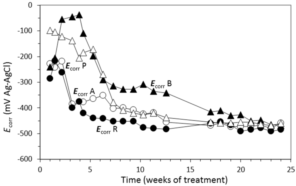 The evolution of the Ecorr values of the specimens not previously treated with ECE, Figure 14, shows that in this case the CP treatment with 15 mA/m2 current density (A) was not able to protect steel from corrosion, since the corrosion potential of steel in A reached values below −400 mV in two weeks, and its values were only slightly higher than those of the non-CP-treated reference specimen (R). This different behavior, when compared to the observations of the precedent paragraph, can be explained by taking into account that the A and R specimens started the 24-week experiments with an initial Cl− content of 2% (relative to cement mass). To this must be added the large progressive Cl− contamination due to the weekly salting regime. On the other hand, the CPrev treatment with 2 mA/m2 current density, given to the initially Cl− free specimen (B) allowed it to maintain values of Ecorr higher than −400 mV, and clearly higher than those corresponding to the non-CPrev-treated reference specimen (P), up to the current interruption at the 13th week. This is a further confirmation of the tolerance increase to chloride-induced corrosion for CPrev treated steel (current densities in the range 0.5–2 mA/m2 of concrete surface). These low cathodic currents, applied from the beginning of the service life of a reinforced concrete structure, decrease the steel potential, thus leading to important increases in the critical chloride content for pitting corrosion of steel [25,26].