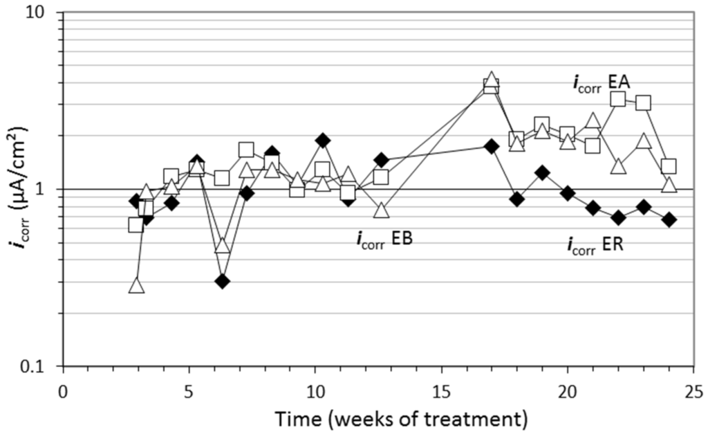 Evolution of icorr during the treatments post ECE. EA: ECE+CP; EB: ECE+CPrev; ER: treated only with ECE. All of them were subjected to Cl− contamination during the 24 weeks. Current density values: CP: 15 mA/m2, CPrev: 2 mA/m2, both related to exposed concrete surface. Adapted from [27].