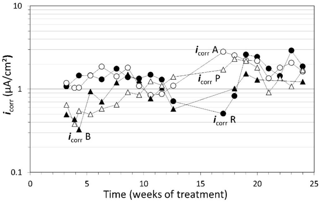 From the observation of the evolution of the steel corrosion rates during the 24-week treatments (Figure 15 and Figure 16), little difference appears between the behavior of the treated specimens (EA, EB, A, B) and their corresponding reference specimens (ER, R, P). Furthermore, in all cases icorr values higher than 0.1–0.2 μA/cm2 were obtained, which means that in no case was a repassivation of steel obtained in open-circuit conditions. A correct interpretation of these observations needs to consider that most of the tested specimens had experienced corrosion before starting the treatments, since the concrete was admixed with 2% Cl− relative to cement mass; and all the specimens were subjected to a severe chloride load during the 24-week treatments. In these conditions it is practically impossible to obtain a permanent repassivation of steel with temporary electrochemical rehabilitation methods [44,45]; even CP or CPrev treatments need to be continuously applied for maintaining the protective conditions for steel.