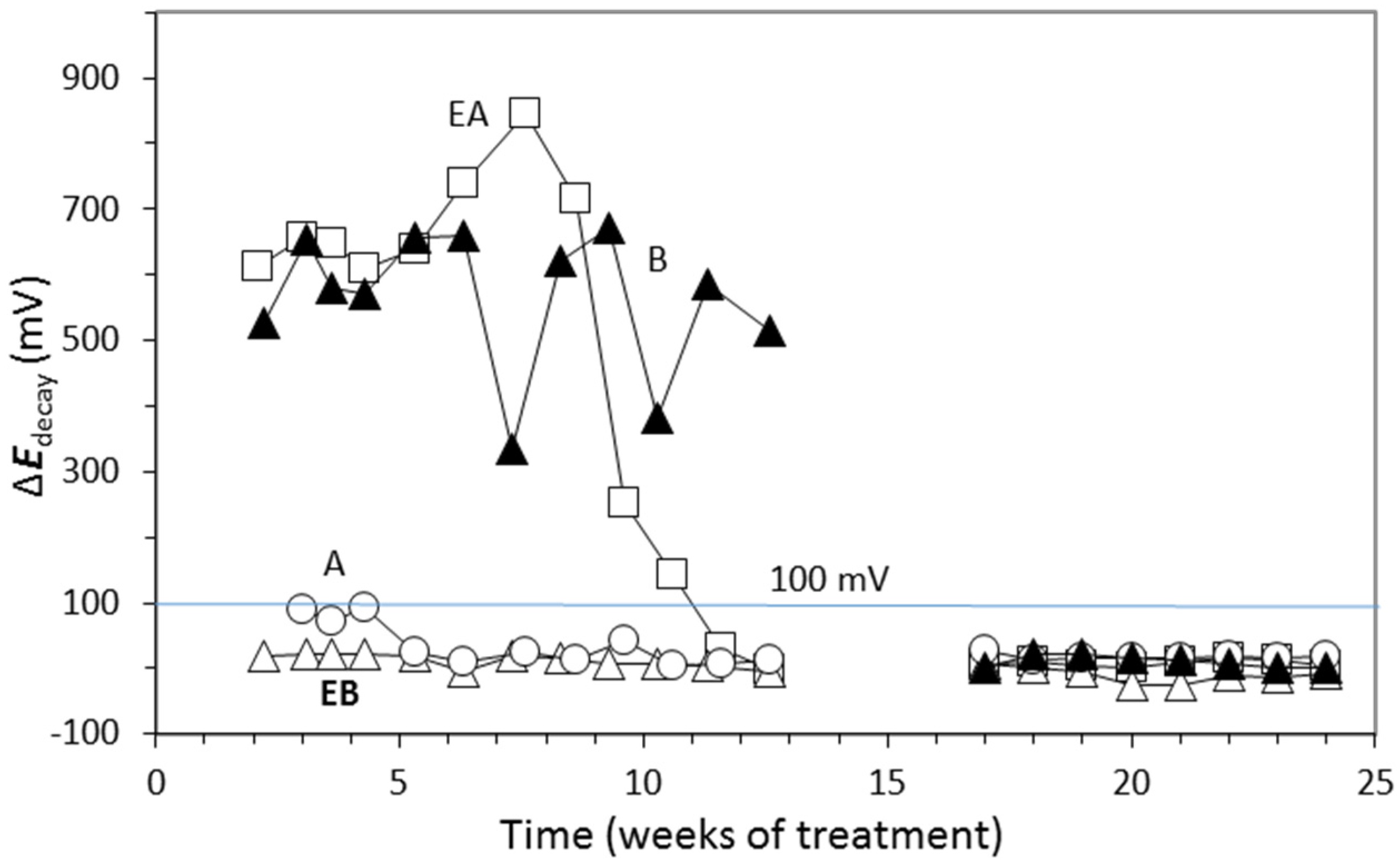 Evolution of ∆Edecay during the CP or CPrev treatments. A: CP; B: CPrev; EA: ECE+CP; EB: ECE+CPrev. All of them were subjected to Cl− contamination during the 24 weeks. The electrochemical treatments were interrupted between week 13 and week 17. Adapted from [27].