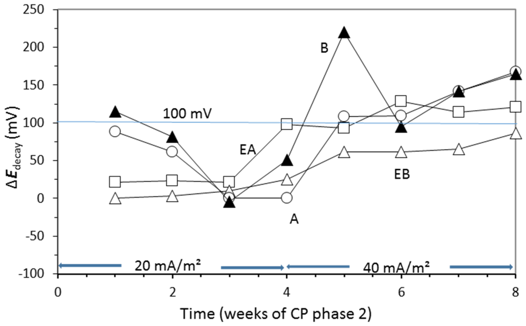 Moreover, protection conditions were verified with the measurement of depolarization potential difference values seven days after switch-off [41]. In fact, more than 150 mV of ∆Edecay was reached after seven days (209 mV for EA, 211 mV for A and 153 mV for B). This efficiency of CP is similar to that obtained by other researchers [10,42]. However, this was not the case for EB. After four weeks with the highest cathodic current density, the protection conditions were not recovered for this latter specimen.