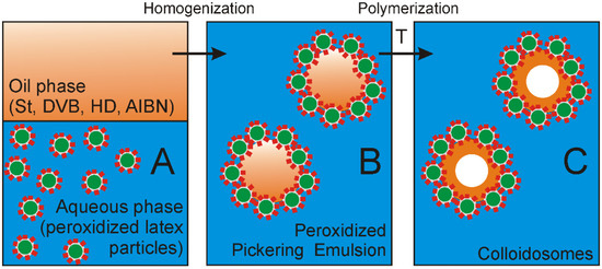 Thus, the synthesis of colloidosomes from Pickering emulsions involves the following steps: (i) synthesis of peroxidized latex particles as reactive building blocks in the colloidosome formation; and (ii) localization of the peroxidized latex particles at the interface, i.e., formation of an oil-in-water Pickering emulsion and the synthesis of colloidosomes using the peroxide groups at the interface.