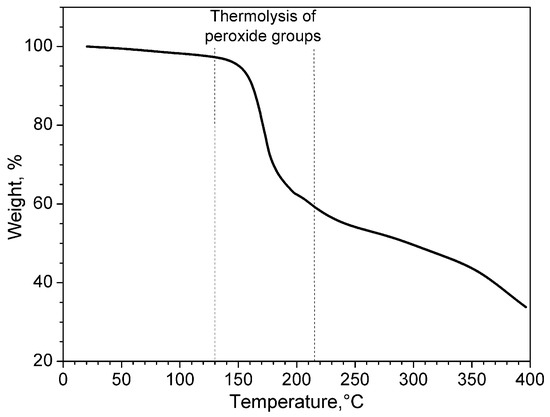 The presence of the peroxide groups in the grafted PM-1-MAc macromolecules was proven by the thermogravimetric analysis of the polystyrene latex. Weight loss at 150–220 °C accompanied by a well-pronounced exothermic effect is characteristic of the decomposition of the ditertiary peroxide groups of PM-1 [28,31,35].