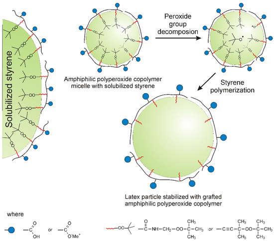 An advantage of the application of PM-1-MAc and PM-2-MAc as polymeric inisurfs is the presence of peroxide groups in the hydrophobic PM units, which are regularly distributed along the macromolecules. During thermolysis, the peroxide groups decompose to form tert-butoxy and macroradicals, which are able to initiate radical reactions of styrene polymerization [28,34]. The combination of the PM-1-MAc and PM-2-MAc macroradicals with the growing polystyrene chains leads to the attachment of the PM-1-MAc and PM-2-MAc macromolecules to the surface of latex particles and to the formation of the polyperoxide PM-1-MAc and PM-2-MAc layers covalently grafted to the polystyrene particle surface (Figure 3).