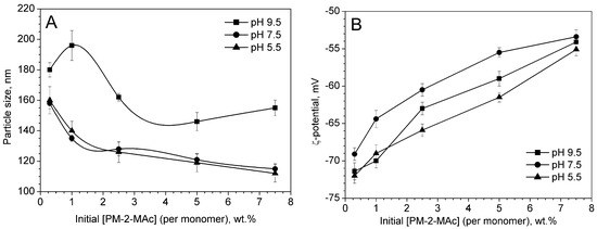 (A) Diamenter and (B) ζ-potential variations of peroxidized latex particles synthesized at 85 °C at different pH levels and PM-2-MAc concentrations.