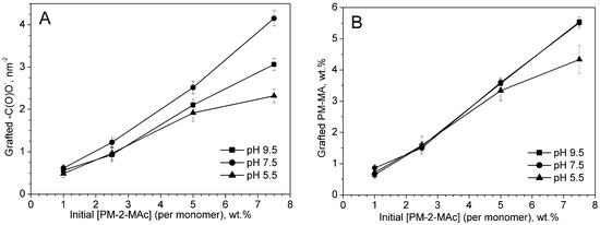 Amount of: (A) carboxyl groups; and (B) PM-2-MAc copolymers on peroxidized latex particles synthesized at different pH levels.