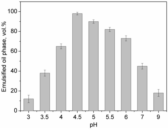 Fraction of remaining emulsified oil phase of Pickering emulsions prepared at various pH levels (recorded after a 24 h rest period).