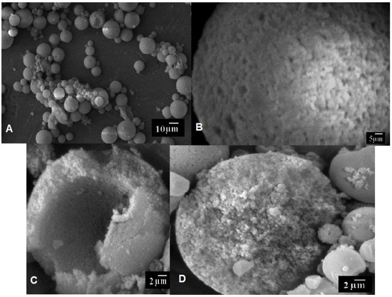 As determined by SEM measurements, the diameter of the synthesized colloidosomes varied in the range of 1.3 μm to 35 μm depending on the synthetic conditions and compositions of the reactive mixture. Figure 8A shows SEM images of colloidosomes polySt-4 (Table 4). The polydispersity of the colloidosome diameter is evidently dependent on a dispersing process during the Pickering emulsion formation; the same behavior was noted in Ref. [20].
