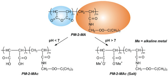 An inisurf PM-2-MAc with carboxyl groups or carboxylate (salt) groups was formed via the hydrolysis of the PM-2-MA copolymer at different pH levels (Scheme 4).